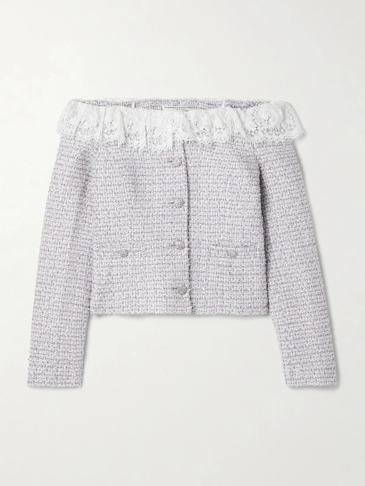 Off-the-shoulder Lace-trimmed Sequin-embellished Metallic Tweed Jacket