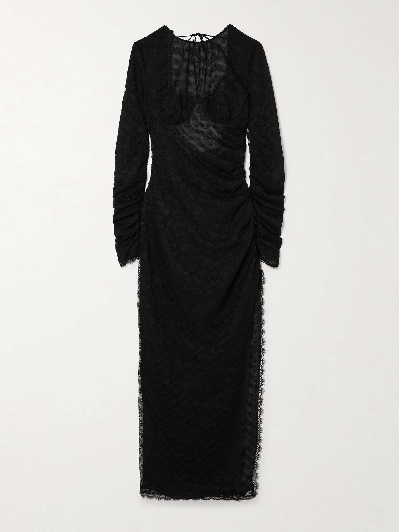 EDITORS'NOTES Alessandra Rich's dress is equal parts romantic and glamorous. Made from black lace, it's fitted with lined, underwired cups so you can forego a bra. The sleeves are subtly ruched for volume, while the open back is framed with pretty scalloping. Wear yours with opaque tights and point-toe pumps. SIZE & FIT - Fits true to size, take your normal size - Designed for a close fit - Mid-weight, non-stretchy fabric - Model is 175cm/ 5'9" and is wearing an IT 40 DETAILS & CARE - Black lace - Tie-fastening keyhole at back - 50% viscose, 50% polyester; lining: 100% silk - Dry clean