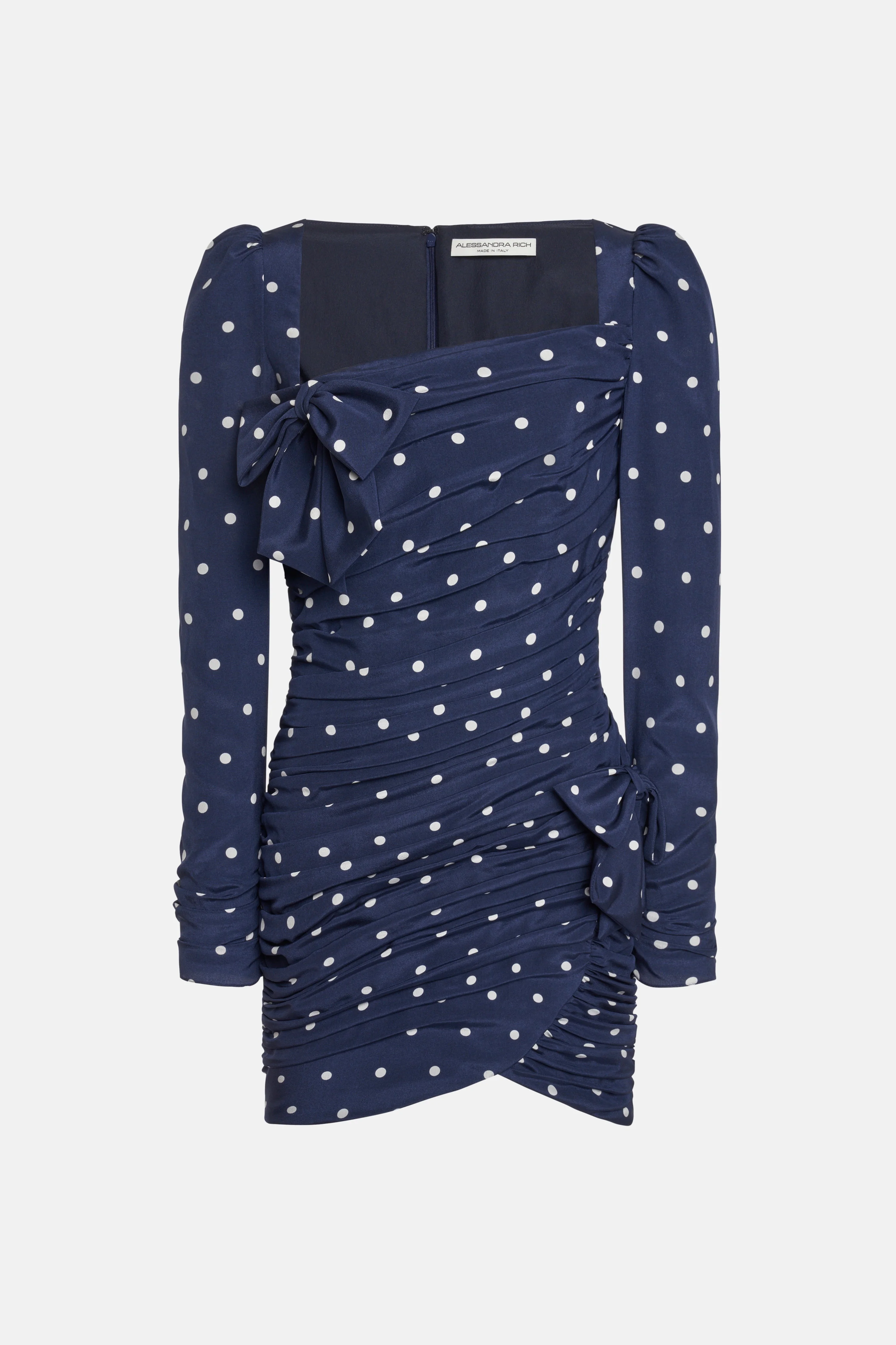 Polka dot print draped mini dress with bows Composition 55% polyamide 34% cotton 11% polyester Lining: 100% polyester Colour: navy blue-white Made in Italy Product code: FABX4125 F4655 1643