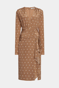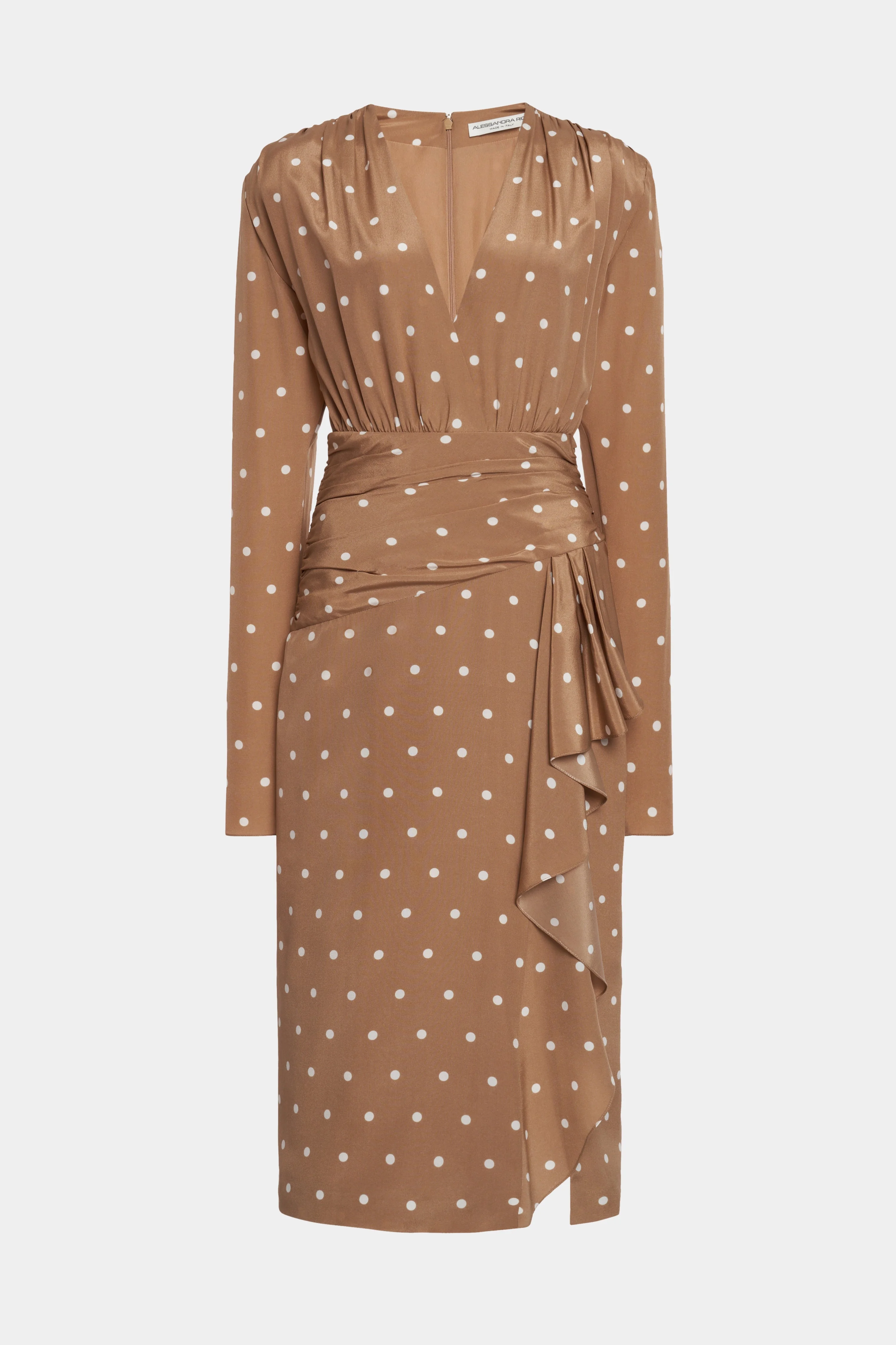 Polka dot print silk dress with volant Composition 100% silk Lining: 100% polyester Colour: camel-white Made in Italy Product code: FABX4109 F4655 1885