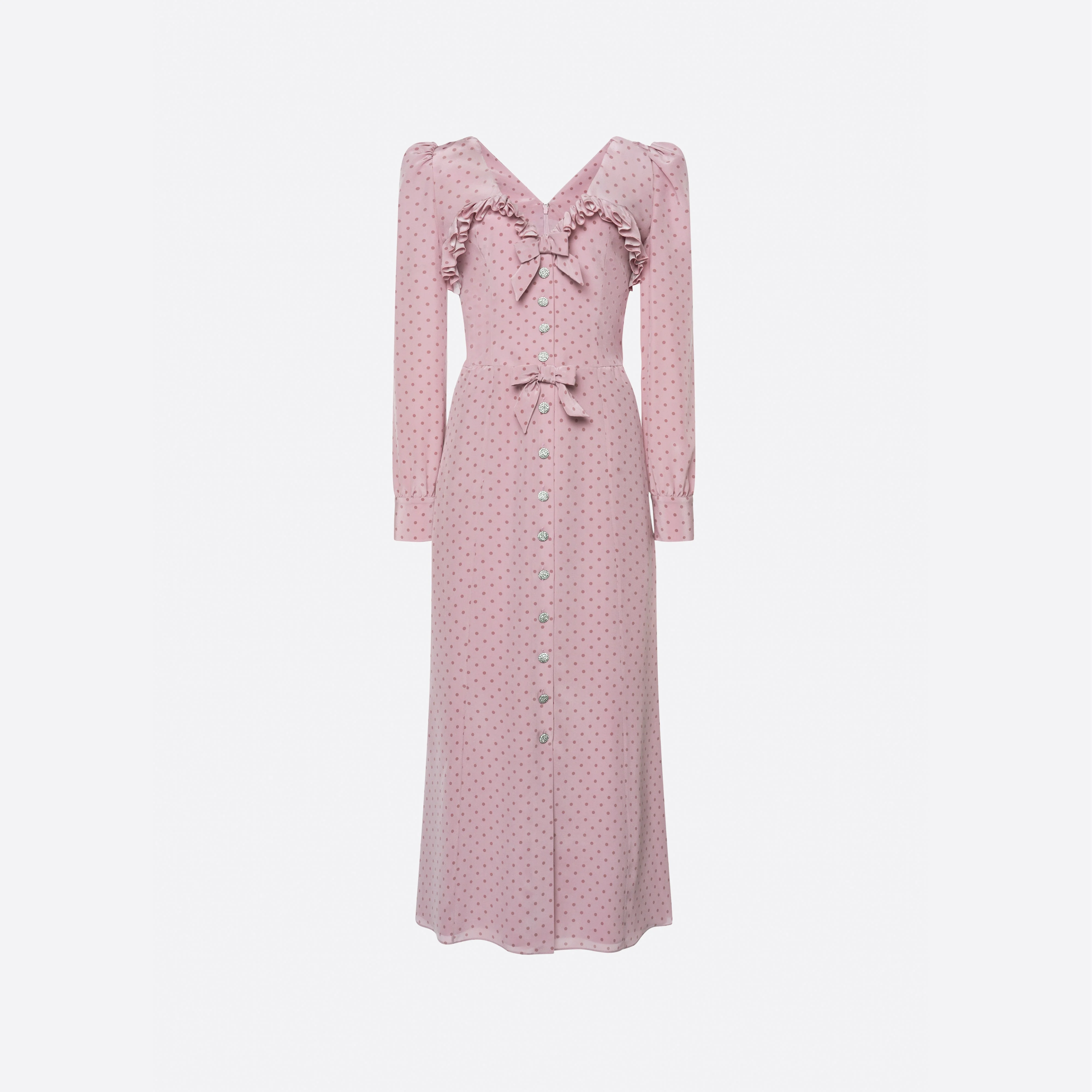 Polka dot print silk midi dress with ruffles Composition 100% silk Lining: 100% polyester Lining 2: 100% polyamide Colour: mauve-mauve Made in Italy Product code: FABX4314 F4686 1941