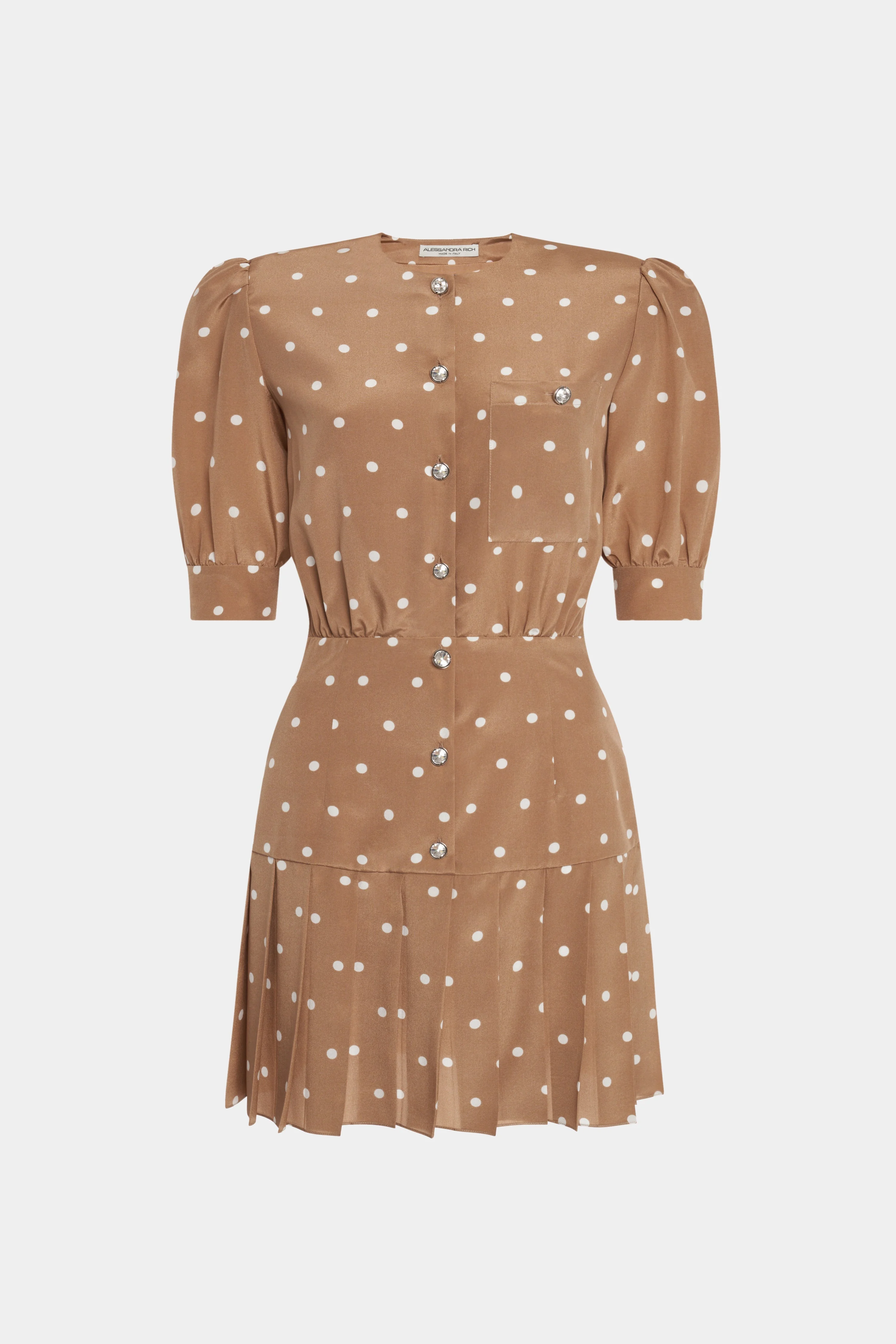 Polka dot print silk mini dress with pleated skirt Composition 100% silk Lining A: 100% polyester Lining B: 100% polyamide Colour: camel-white Made in Italy Product code: FABX4116 F4655 1885