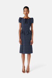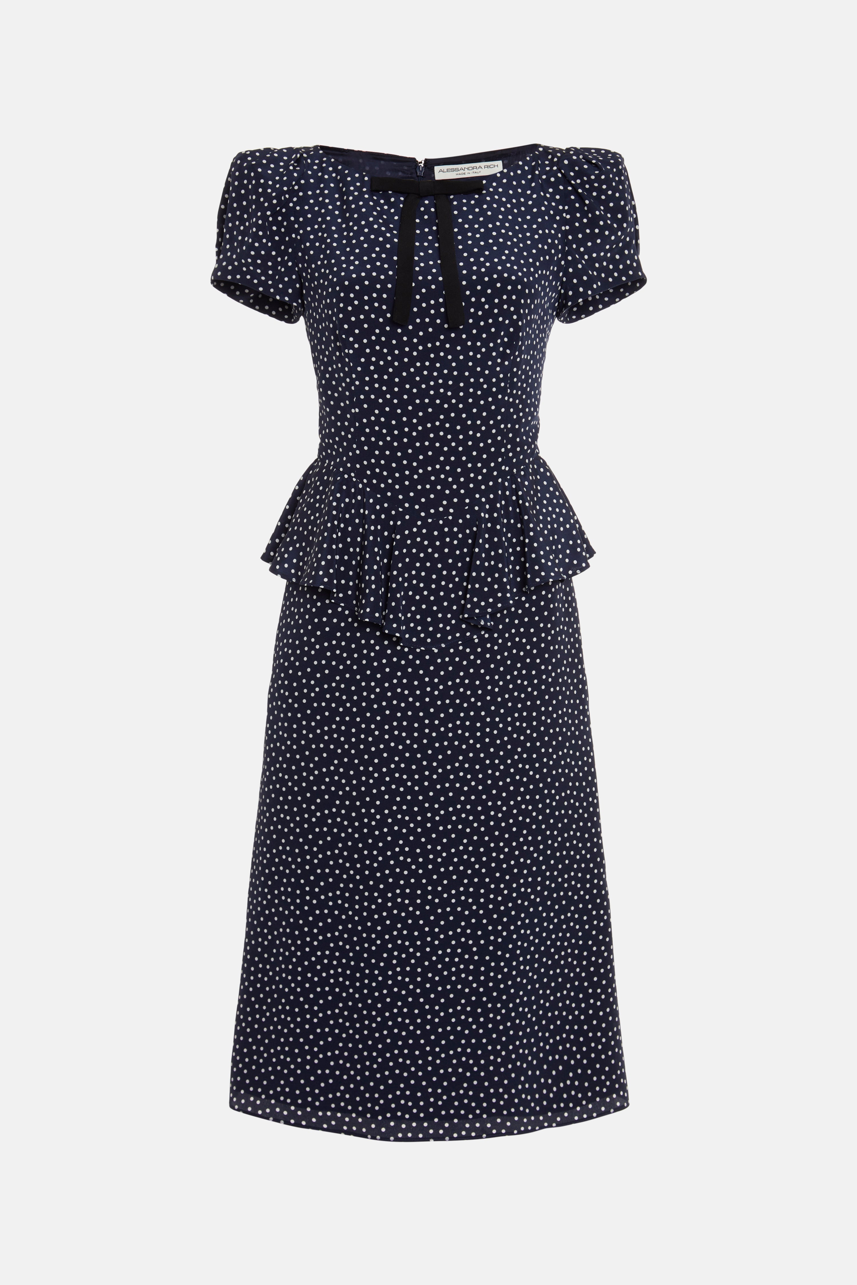 Polka dot print silk dress with peplum Composition 100% silk Lining: 100% cupro Colour: navy blue-white Made in Italy Product code: FABX4007 F4510 1944