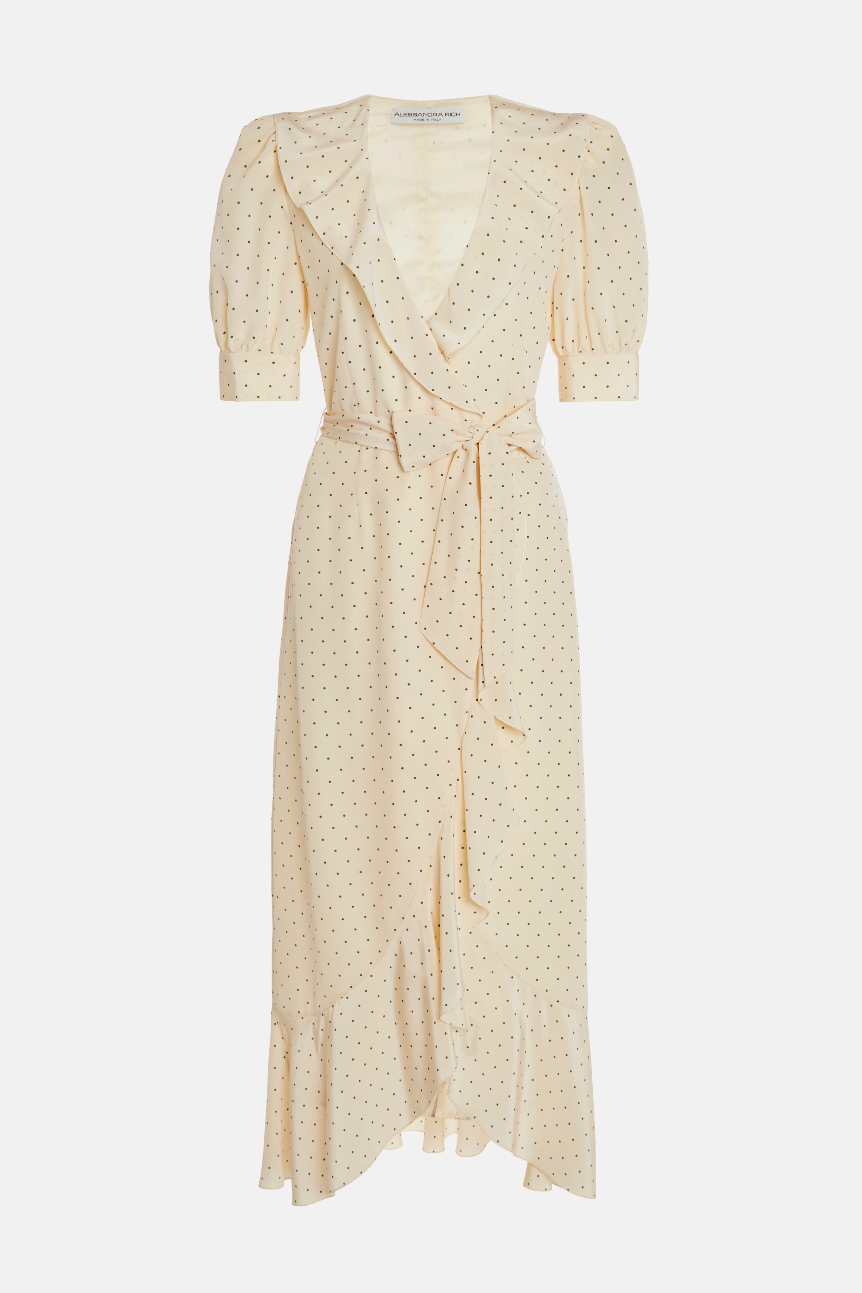 Polka dot print silk wrap dress with belt Composition 100% silk Lining: 100% cupro Contais nontextile parts of animal origin Colour: cream-green Made in Italy Product code: FABX4006 F4508 1822