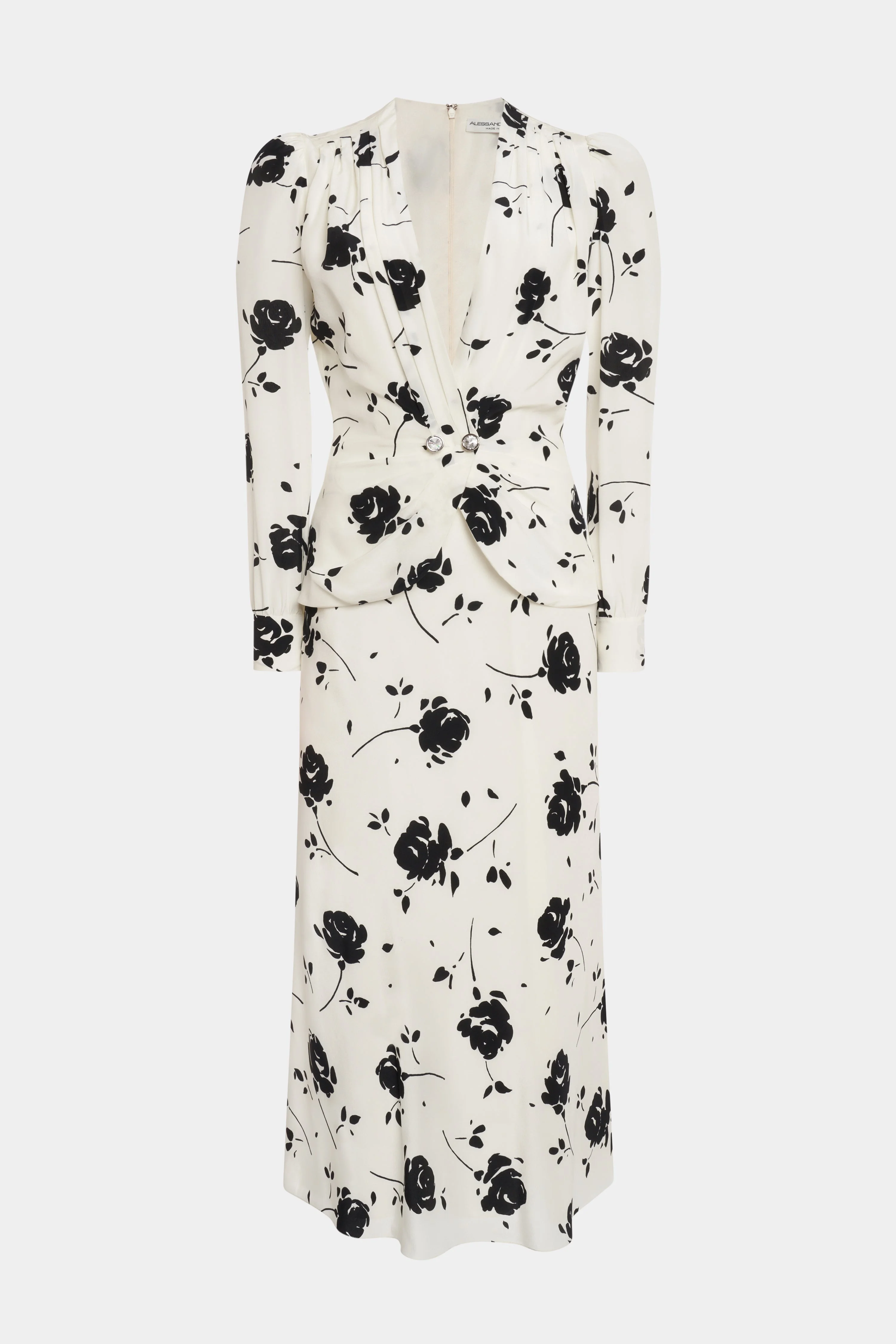 Rose print silk dress with jewel buttons Composition 100% silk Lining: 100% polyester Colour: white-black Made in Italy Product code: FABX4108 F4567 0822