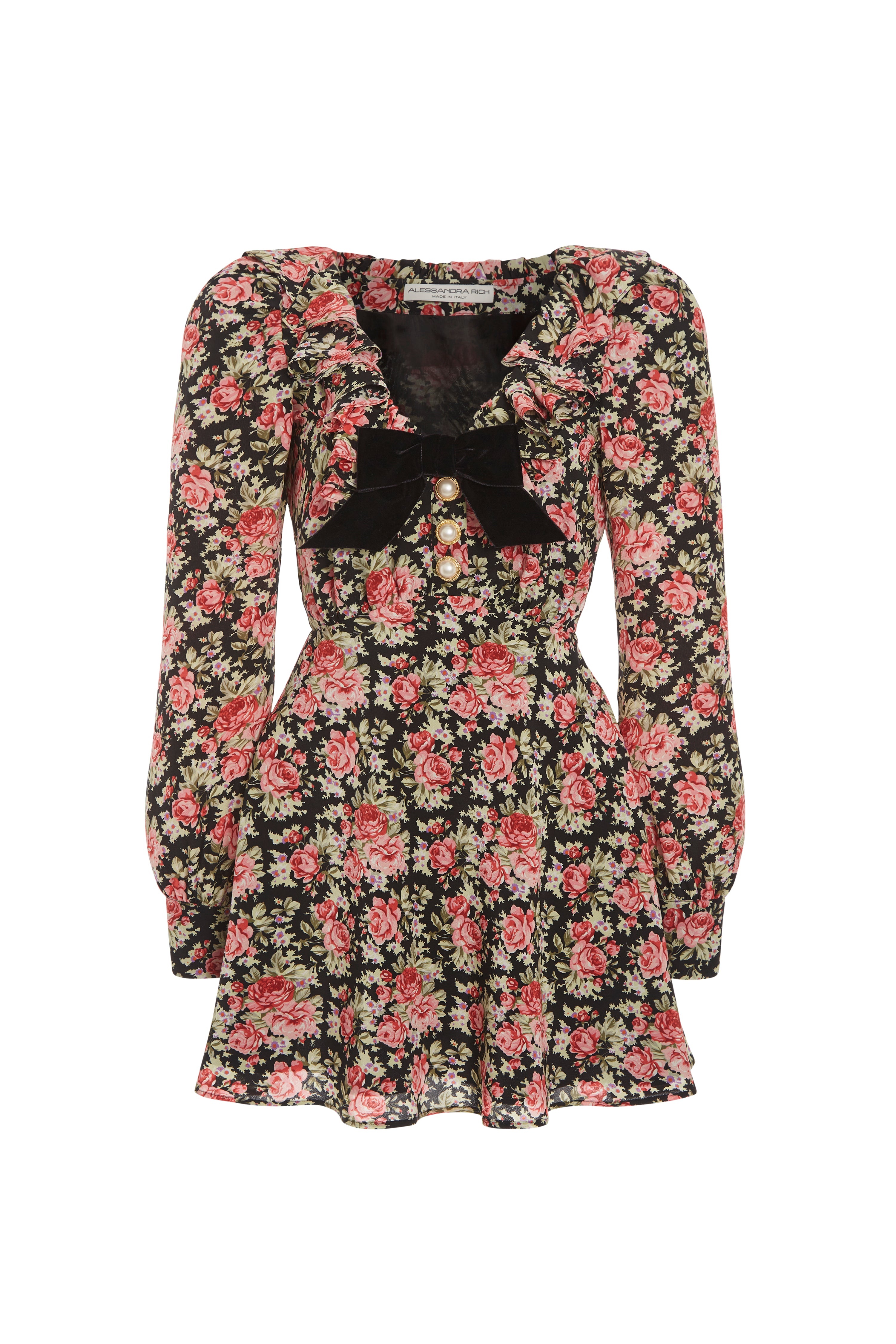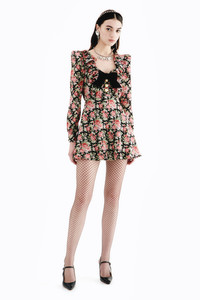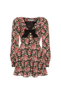 Black pink rose print mini dress with volant collar and velvet bow detail DETAILS (A)10%silk (b)100%polyamid Lined in (A)100%copper (b)100%polyamid long sleeves mini dress with side zip closure Style reference: FAB3493-F4001-900 Made in Italy