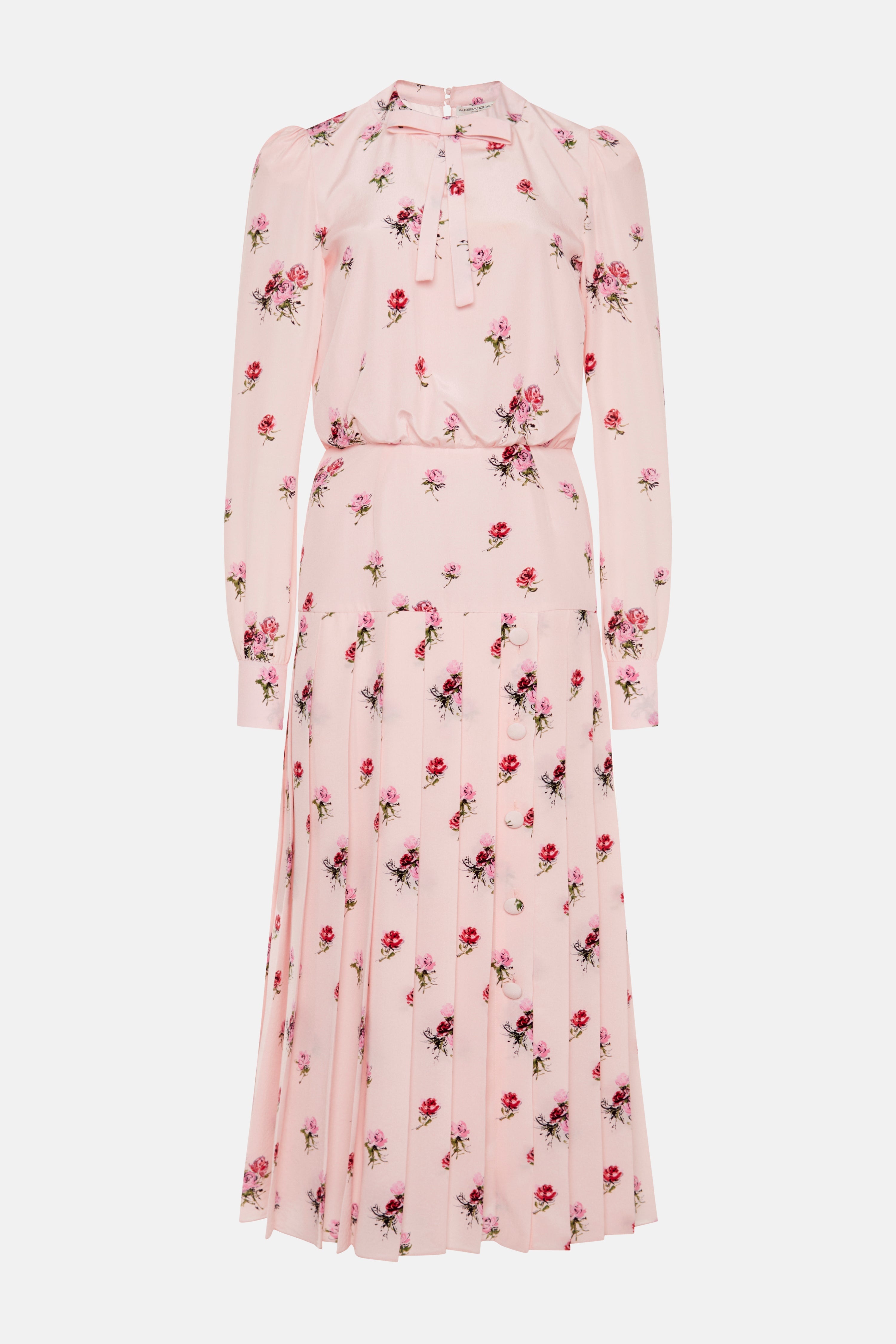 Rose print silk pleated dress Composition 100% silk Lining: 100% cupro Colour: pink-red Made in Italy Product code: FABX4020 F4466 1816