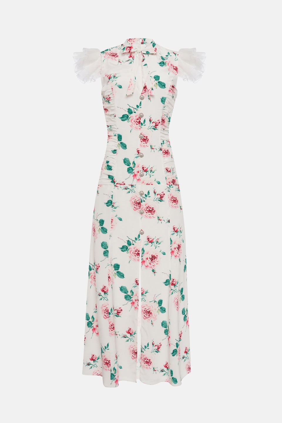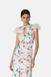 ROSE PRINT SILK DRAPED DRESS W/ ORGANZA SLEEVES DETAILS (A)100%SE (B)100%SE LINING:(A)100%CU Style reference : FABX3741 F4297 0822 WHITE