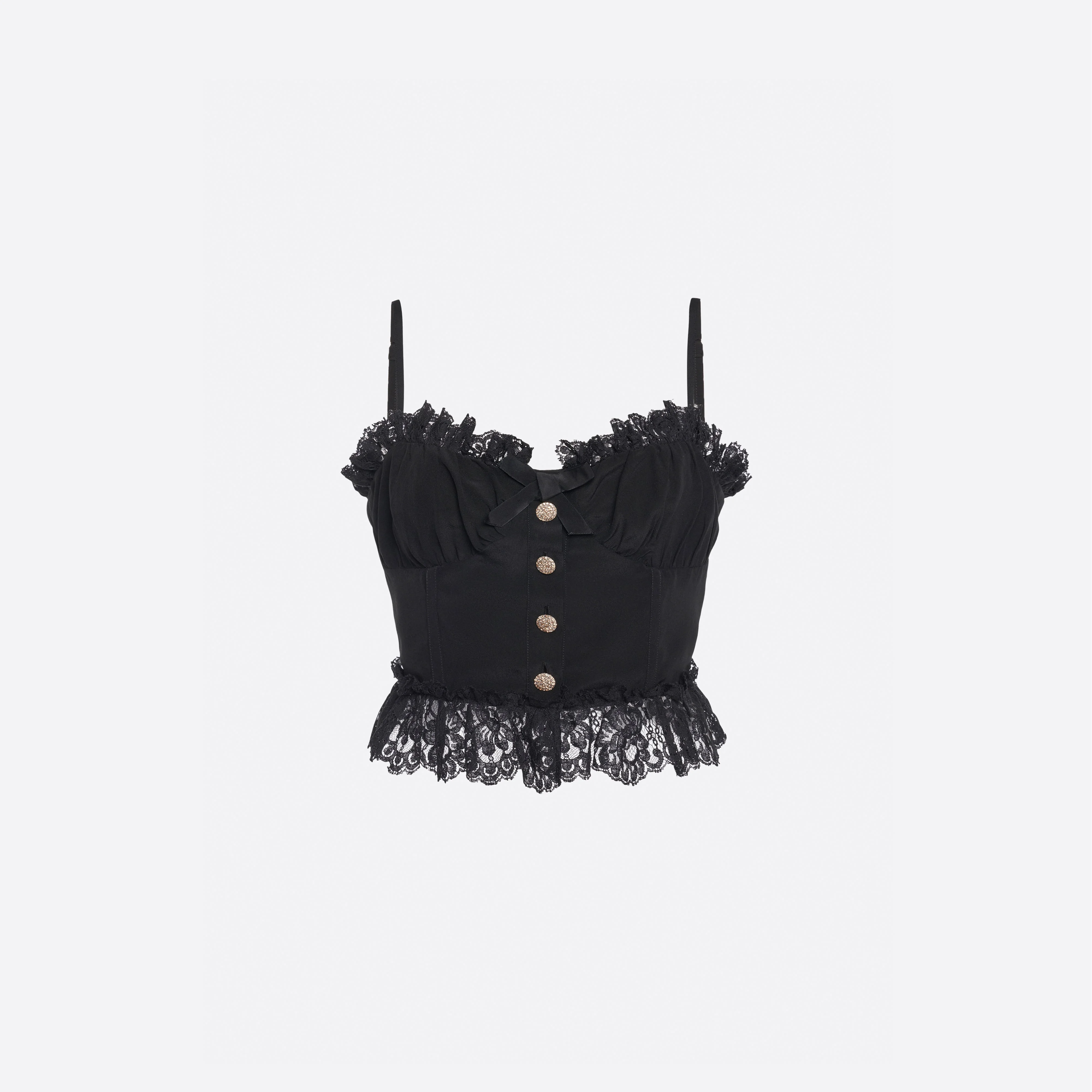 Silk bustier top with lace ruffles Composition 100% silk Ruffles: 70% cotton 30% polyamide Bow: 100% silk Lining: 100% polyester Colour: black Made in Italy Product code: FABX4320 F3057 0900