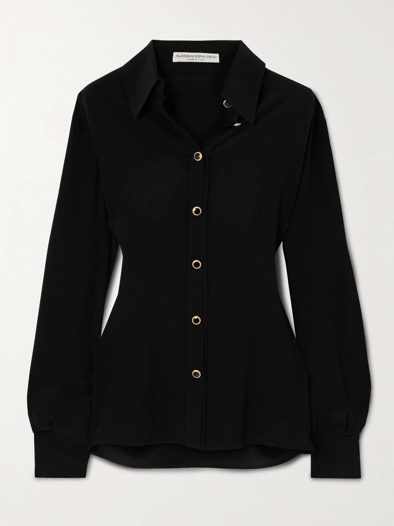 EDITORS'NOTES There's always more than first meets the eye to Alessandra Rich's wardrobe classics. This shirt has been cut in Italy from smooth, lightweight silk-crepe with a subtly lustrous finish and elegant, slim fit. Coordinate your jewelry with the embellished buttons threading the front. SIZE & FIT Model measurements: - Fits true to size, take your normal size - Designed for a slim fit - Lightweight, non-stretchy fabric - Model is 177cm/ 5'10" and is wearing an IT 40 - Bust: 79cm/ 31" - Waist: 61cm/ 24" - Hip: 89cm/ 35" DETAILS & CARE - Black silk-crepe - Button fastenings through front - 100% silk - Dry clean