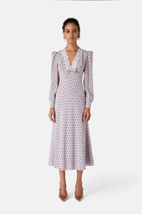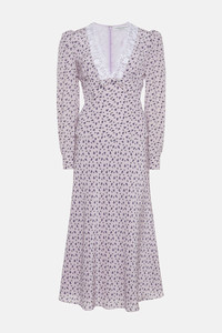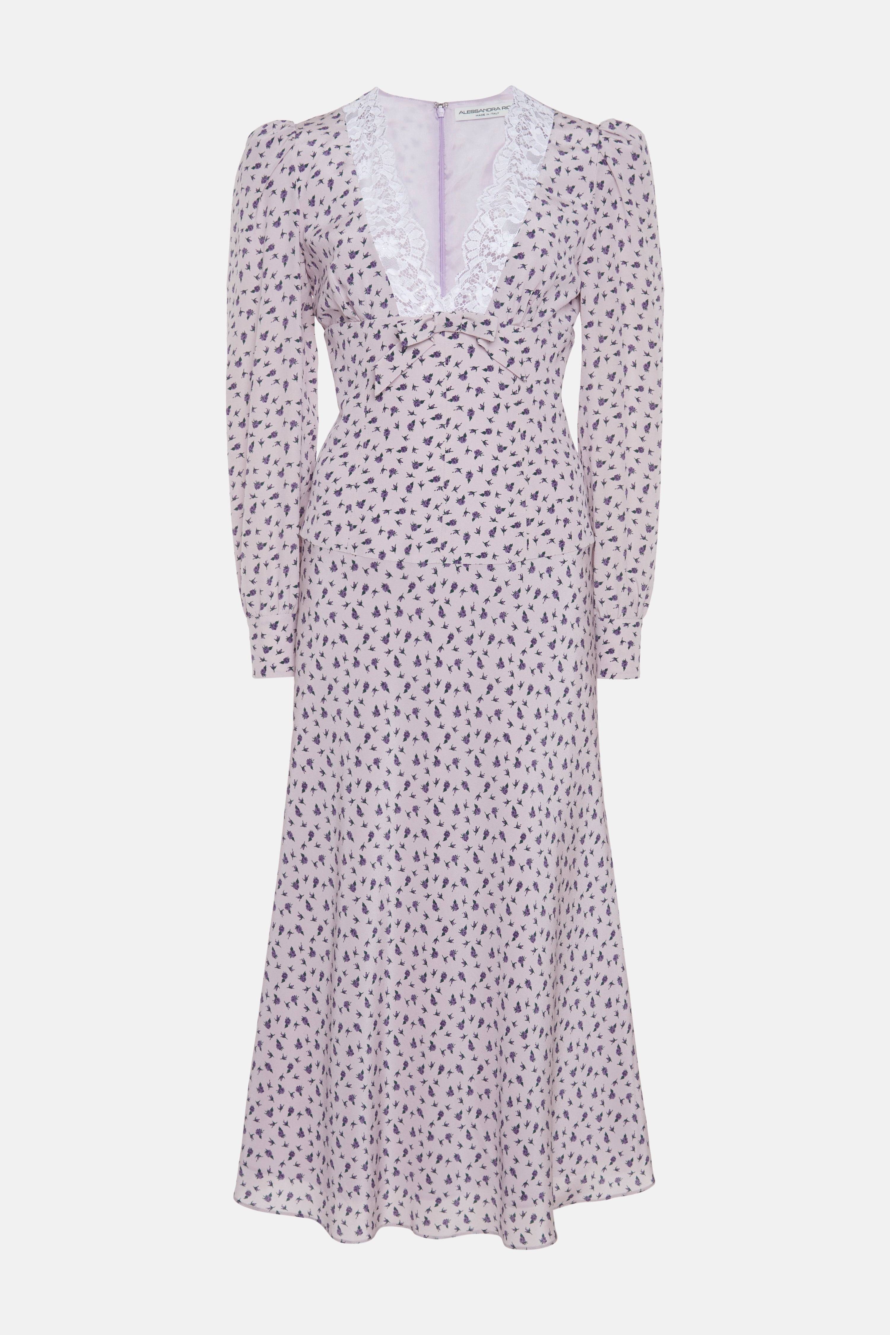 Small rose print silk v-neck dress with lace trim Composition 100% silk Collar: 85% cotton 15% polyamide Lining: 100% cupro Colour: lilac-violet Made in Italy Product code: FABX3985 F4464 1911