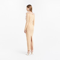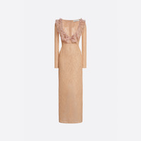 Stretch lace evening dress with organza ruffles Composition 80% polyamide 20% lyocell Ruches: 100% silk Lining: 87% polyamide 13% elastane Colour: nude Made in Italy Product code: FABX4268 P1242 1855