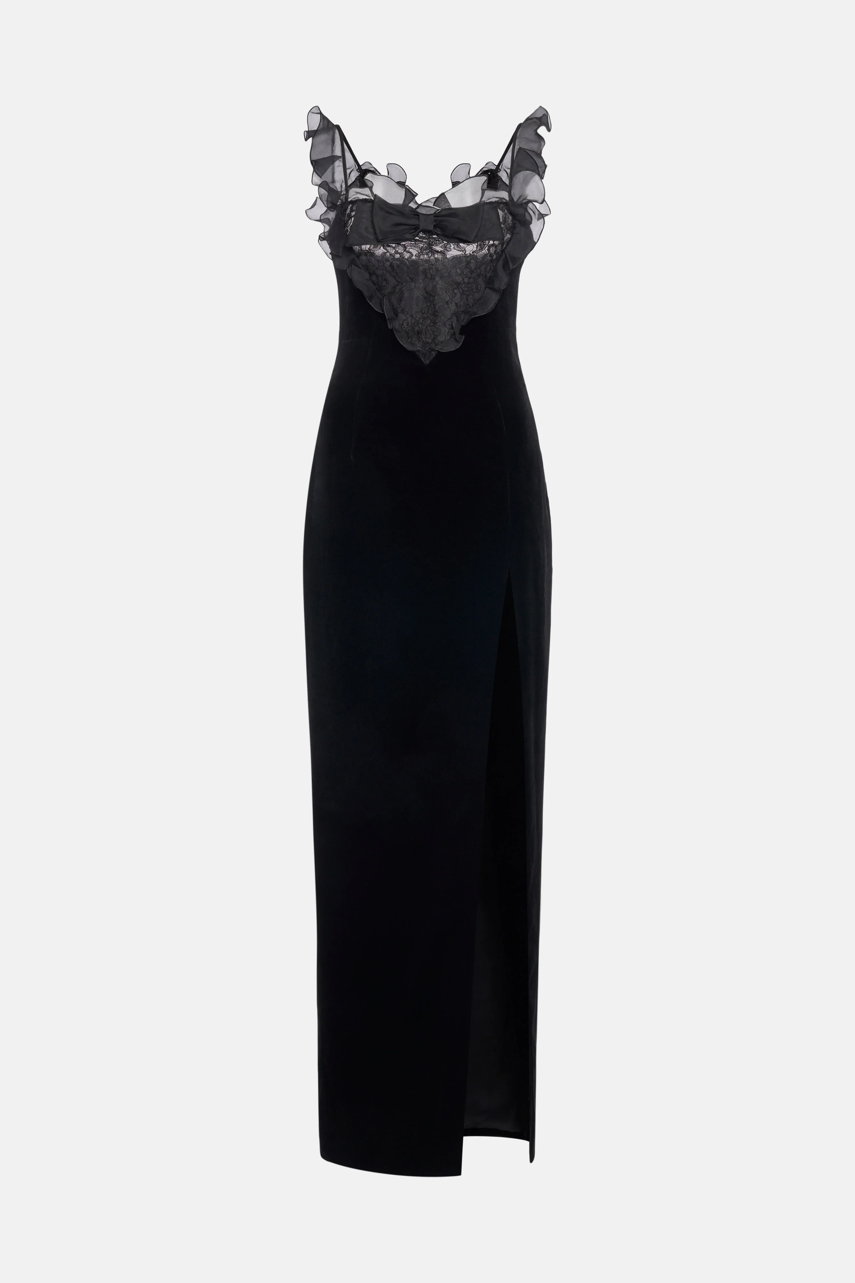 Velvet dress with split with lace bustier Composition 75% viscose 15% silk 10% elastane Bow: 100% silk Lace: 42% polyamide 58% viscose Lining: 95% cupro 5% elastane Lining 2: 74% polyamide 26% elastane Colour: black Made in Italy Product code: FABX4262 F2603 0900