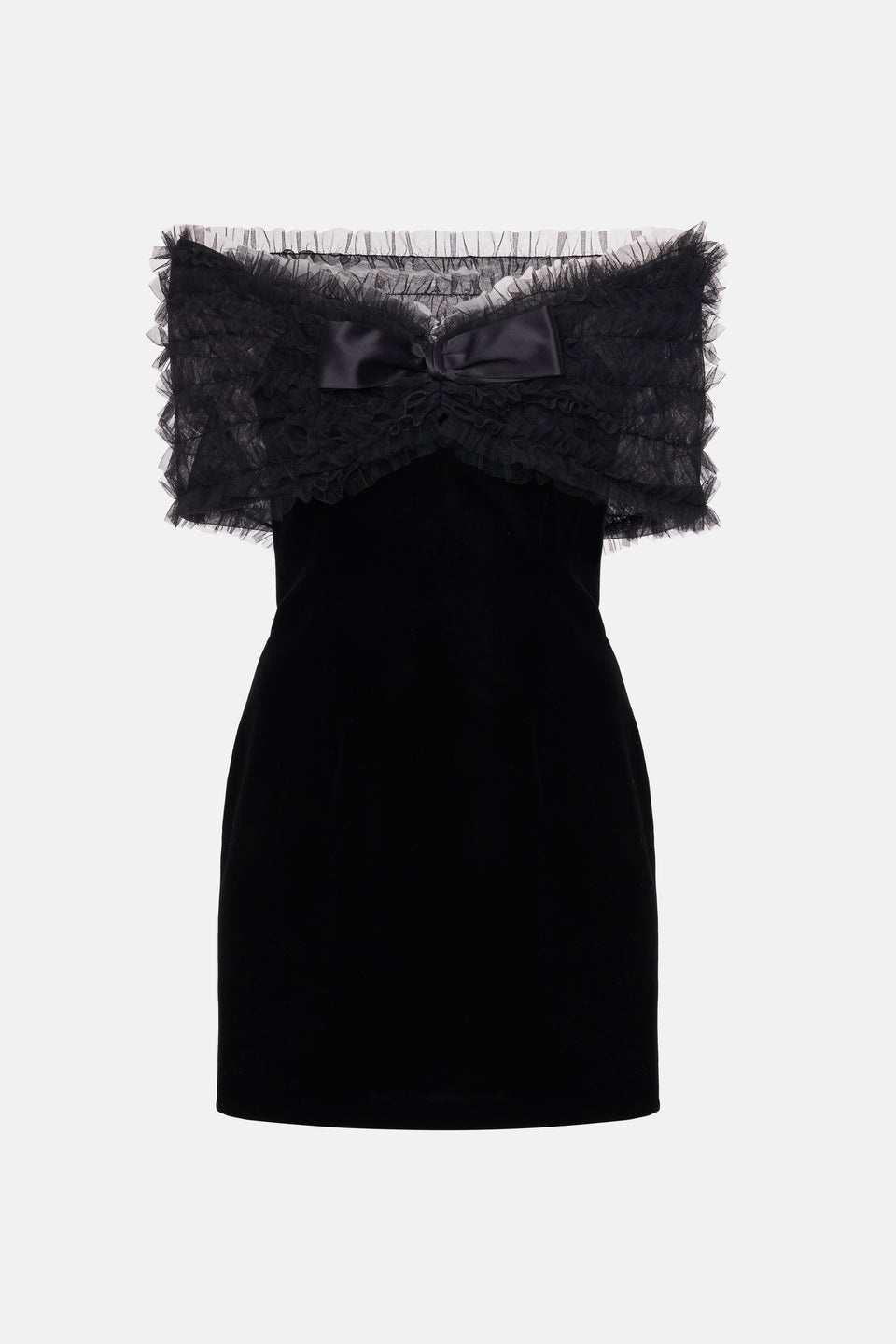 VELVET OFF THE SHOULDER MINI DRESS W/ RUCHED TULLE DETAILS (A)75%VI 15%SE 10%EA (B)100%PA (C)100%SE (D) 100%PA LINING:(A)65%VI 35%PL Style reference : FABX3845 F2603 0900 BLACK