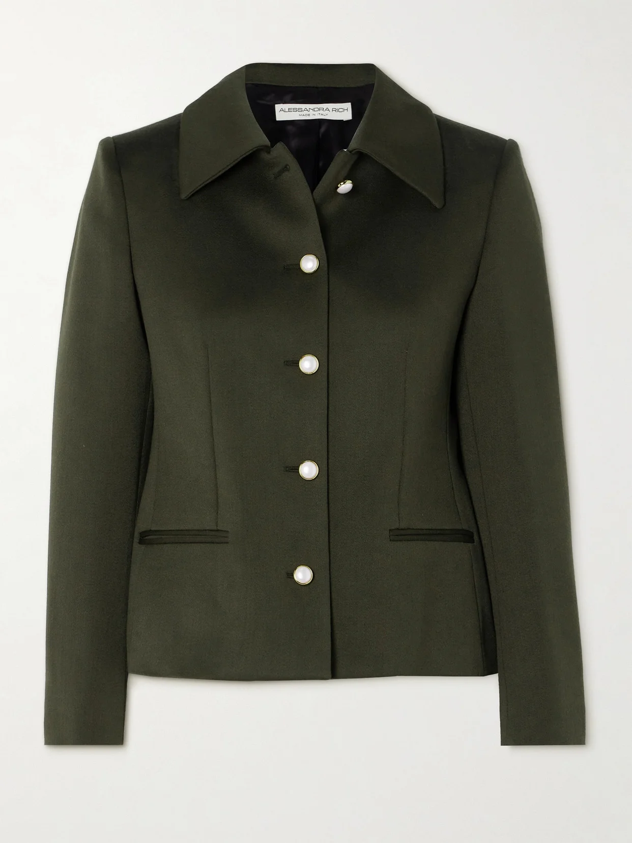 Alessandra Rich's jacket is neatly tailored for an elegant, vintage-inspired feel. Made from wool-crepe, it's darted through the front to nip in the waist just a touch and has a classic collar leading to lustrous faux pearl buttons. We have the matching mini skirt in our edit, too.