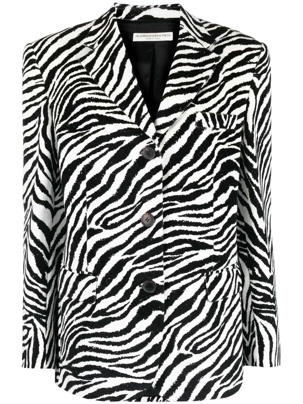 zebra-print single-breasted blazer Alessandra Rich's bold aesthetic is captured in the design of this single-breasted blazer. Crafted in a confident boxy-shaped silhouette, the piece is enveloped in a monochromatic zebra print for a striking finish. Made in Italy Composition Outer: Cotton 100% Lining: Viscose 100% SIZE & FIT Model measurements Height 5 ft 10 in(1.78 m) Bust/Chest 30.31 in(77 cm) Hips 36.61 in(93 cm) Waist 24.8 in(63 cm) FittingInformation This piece fits true to size. We recommend you get your regular size Cut for a loose fit Made with a mid-weight non-stretch fabric Measurement SLEEVE LENGTH 23.5 in(59.7 cm) LENGTH 27.99 in(71.1 cm) WAIST 37.99 in(96.5 cm) BUST 40 in(101.6 cm) Washing instructions Dry Clean Only