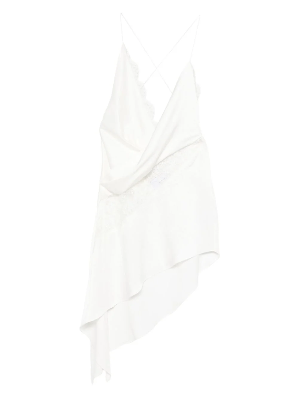 lace asymmetric mini dress Highlights - White - Lace trim - Spaghetti straps - Asymmetric hem - Draped detail - Crossover straps Imported Composition Acetate 80%, Polyamide 48%, Modal 26%, Cotton 26%, Polyester 20% SIZE & FIT Model measurements Height 5 ft 10 in(1.78 m) Bust/Chest 31.49 in(80 cm) Hips 37 in(94 cm) Waist 23.62 in(60 cm) Washing instructions Dry Clean Only
