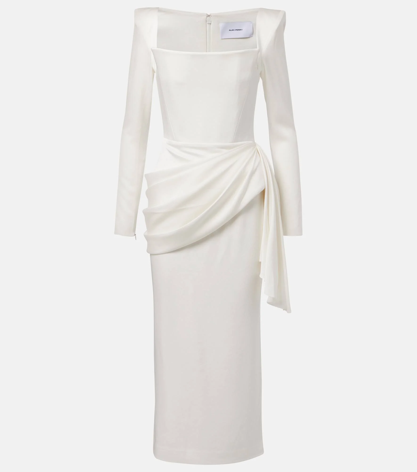 Step into the limelight with styles from Alex Perry, which have illuminated the red carpet time and time again. Crafted from luxurious crepe satin, this bridal gown features a bustier bodice, wide square neckline, and elegant draped folds across the waist. Product Details - Material: 80% acetate, 20% polyester - Care instructions: dry clean - Made in China - Designer color name: White - Item color: white - Shoulder pads - Short vent - Closure: zip and hook fastening - Sleeves: long-sleeved - Cuff: zipped - Boning - Item number: P01044149 Size & Fit - True to size - Oversized shoulders - Shoulder pad inserts - Internal boned corset for support - Cinched waist - Non-stretchy fabric - slit length 37cm-14.5" - The model seen in the picture is 178cm-5'10" and wearing a size UK 8