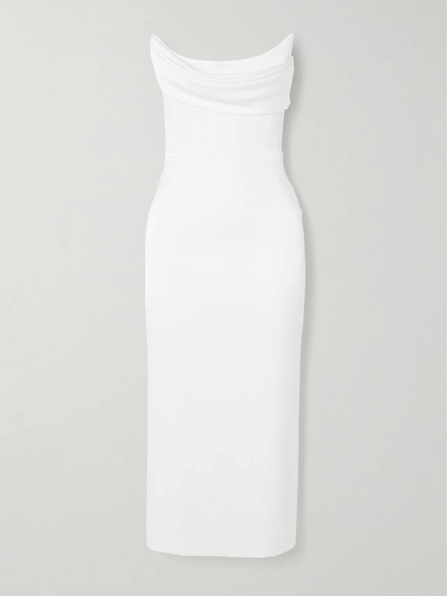 Alex Perry is an expert at crafting elegant eveningwear with couture-like precision. This midi dress is cut from white satin-crepe with a beautifully draped strapless neckline. The form-fitting bodice is supported by an internal corset and the back vent ensues you can move with ease. We think it makes a stunning choice for your big day, especially if you're hosting at a more modern venue. Size & Fit - Fits large to size, take one size smaller than normal - Designed to sculpt and hold your figure - Mid-weight, non-stretchy fabric - Model is 180cm/ 5'11", normally wears a UK 8 and is wearing a UK 6 Model measurements: - Bust: 81cm/ 32" - Waist: 67cm/ 26.5" - Hip: 90cm/ 35.5" Details & Care - White satin-crepe - Concealed zip fastening along side - 84% acetate, 16% polyester - Dry clean Large to size. See Size & Fit notes.