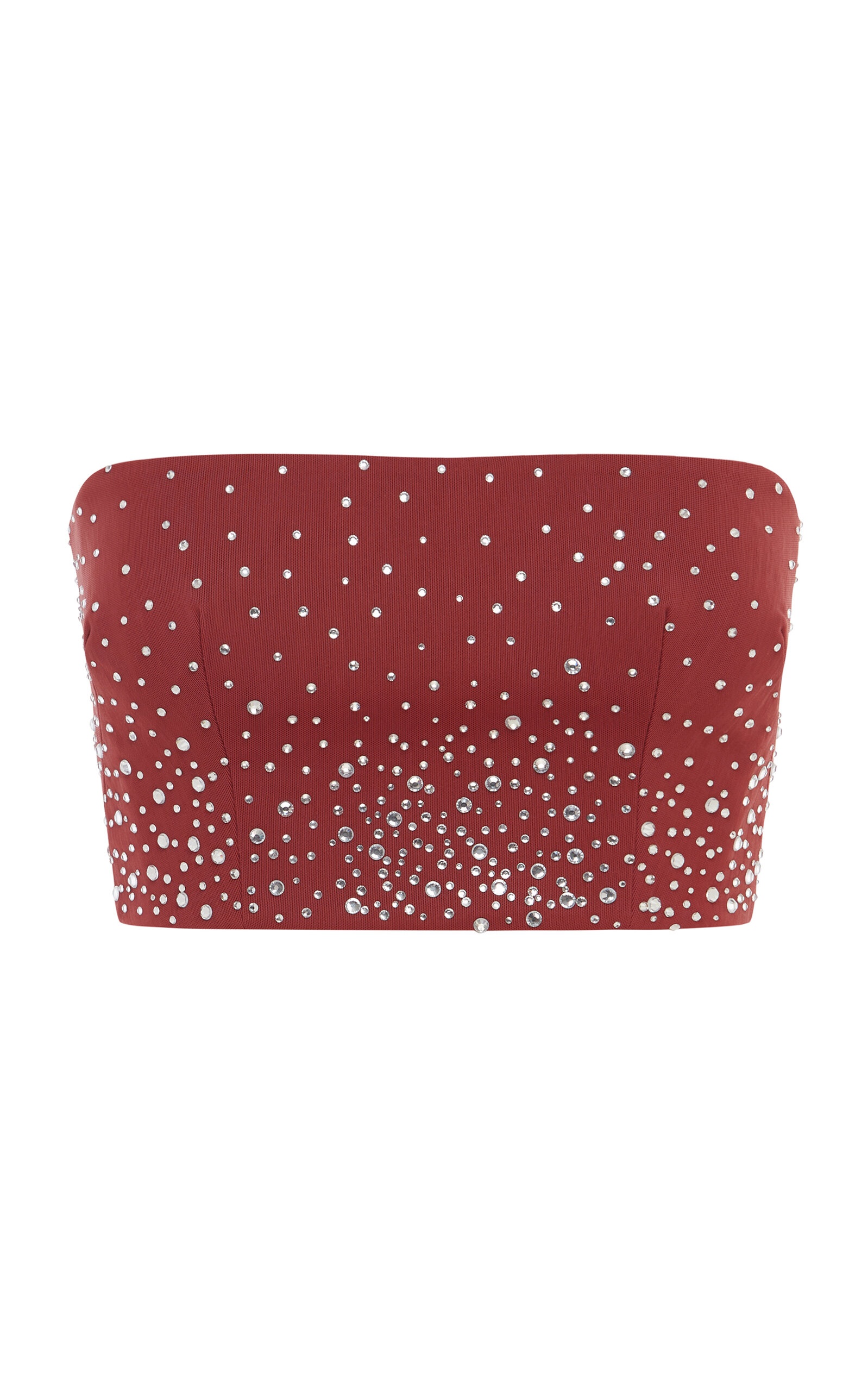 PRODUCT DETAILS - Strapless, cropped hem, crystal embellishments - Lining: Power Mesh - Composition: Power Mesh - Color: red - Concealed zip fastening along back - Made in China