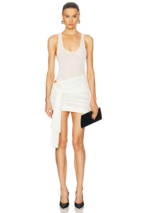 Details - 91% recycled polyester, 9% elastane - Made in China - Dry clean only - Unlined with attached bodysuit with gusset snap button closure and thong back - Hidden side zipper closure - Tie detail at hip with draped fabric - Lightweight slinky crepe fabric - Our Style No. APEF-WD219 - Manufacturer Style No. D1496SS25