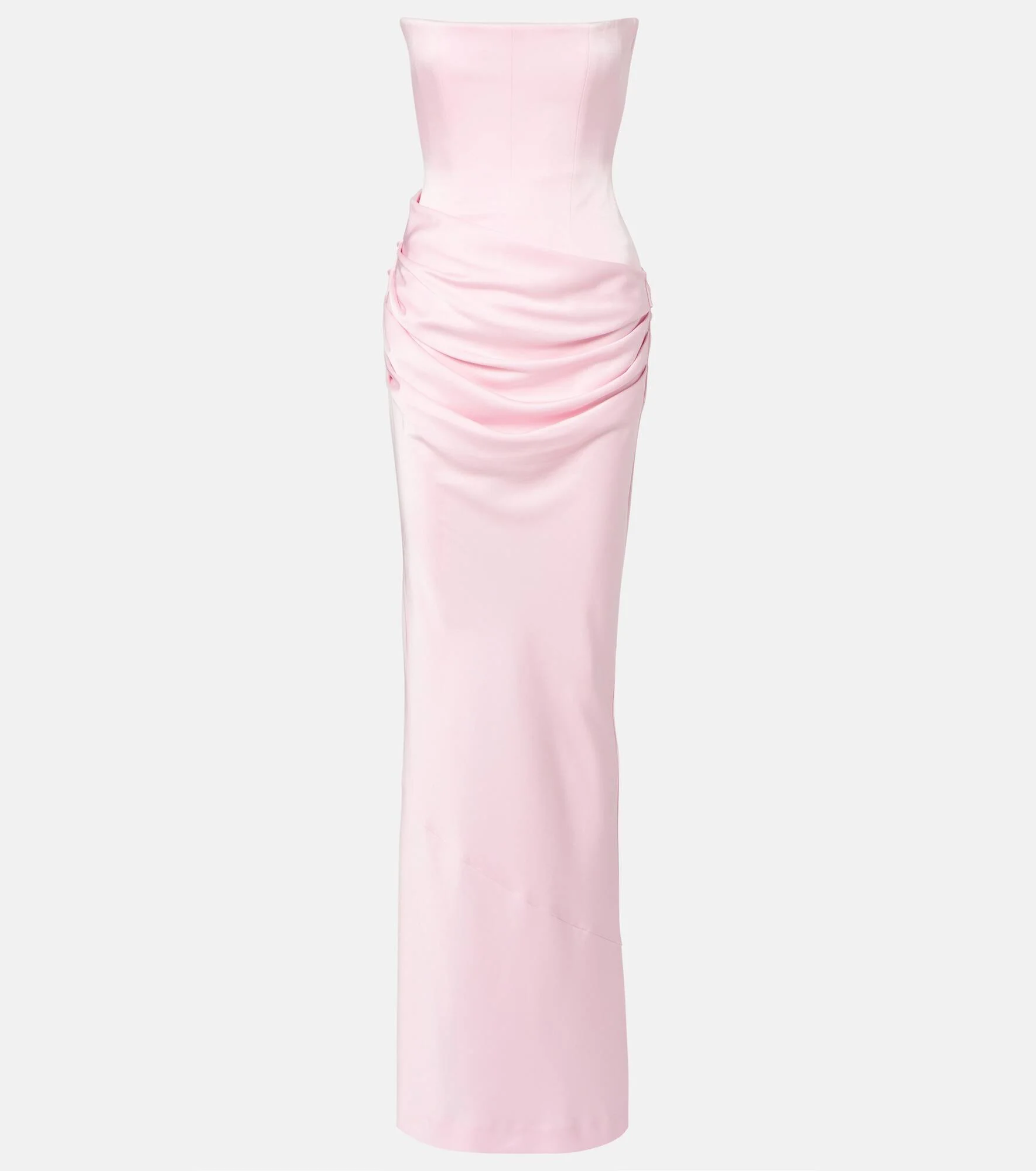 Standout in Alex Perry, whose designs are known for their sharp, refined impact on the red carpet. This bustier dress boasts a strapless bodice that cascades into a sculptural, draped silhouette. Product Details - Material: 80% acetate, 20% polyester - Care instructions: dry clean - Made in China - Designer color name: Powder Pink - Item color: pink - Built-in bustier - Closure: zipped back - Long vent - Partially lined - Item number: P01081209 Size & Fit - True to size - Strapless - Internal boned corset for support - Fitted - Non-stretchy fabric - The model seen in the picture is 178cm-5'10" and wearing a size UK 8