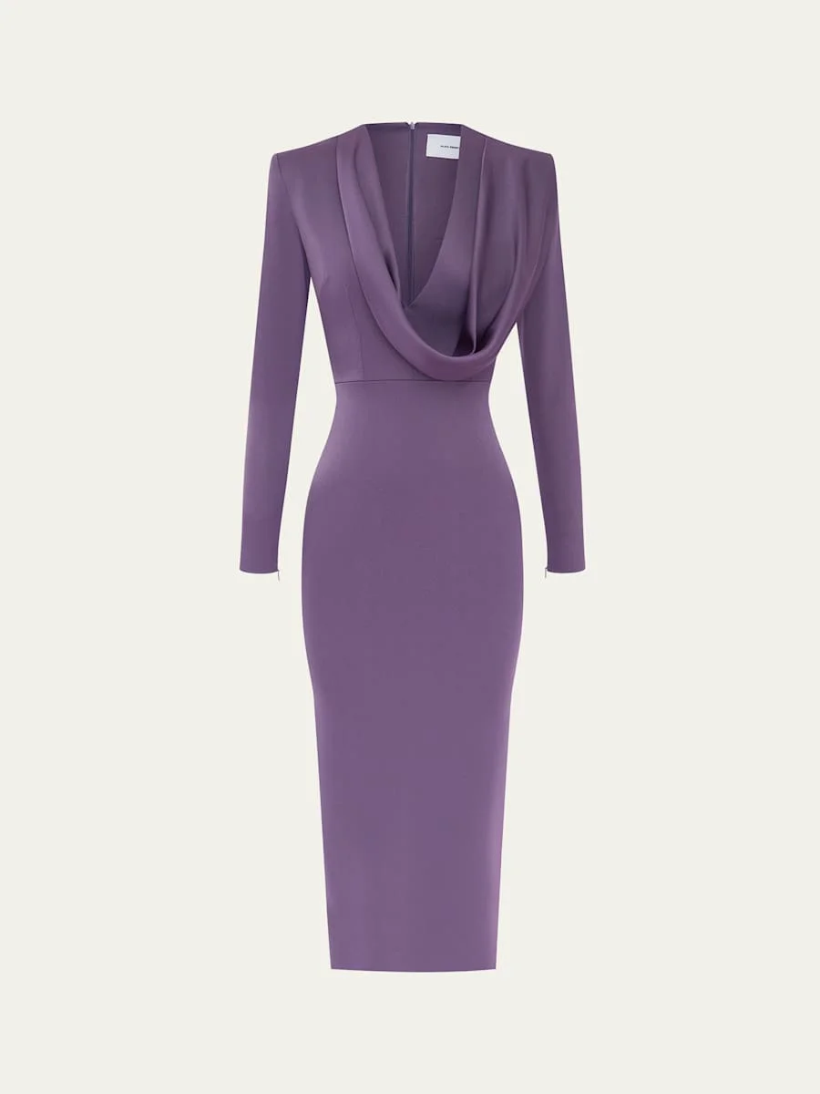 Draped Cowl-Neck Strong-Shoulder Satin Crepe Midi Dress