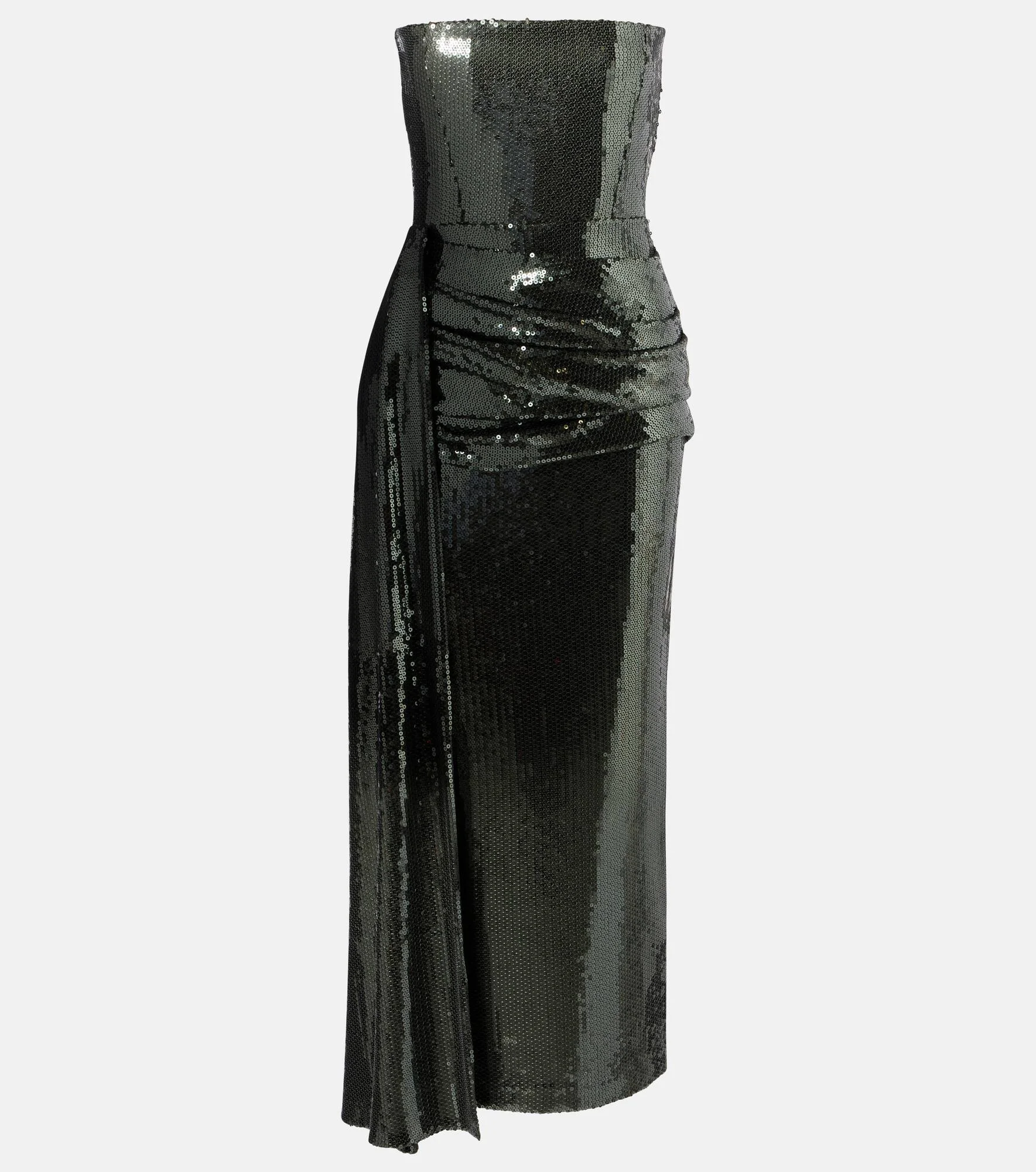 This strapless corset dress by Alex Perry stuns with an asymmetric drape at the hip and an all-over sequin finish. Designed with a carpet-ready silhouette, this piece features a zip-back closure. Product Details - Material: 95% polyester, 5% elastane - Care instructions: dry clean - Made in China - Designer color name: Dark Olive - Item color: green - Lining: 84% acetate, 16% polyester - Boning - Closure: invisible zipper - Item number: P01051497 Size & Fit - True to size - Strapless - Internal boned corset for support - Fitted - Non-stretchy fabric - slit length 48cm-19" - The model seen in the picture is 178cm-5'10" and wearing a size UK 8
