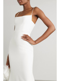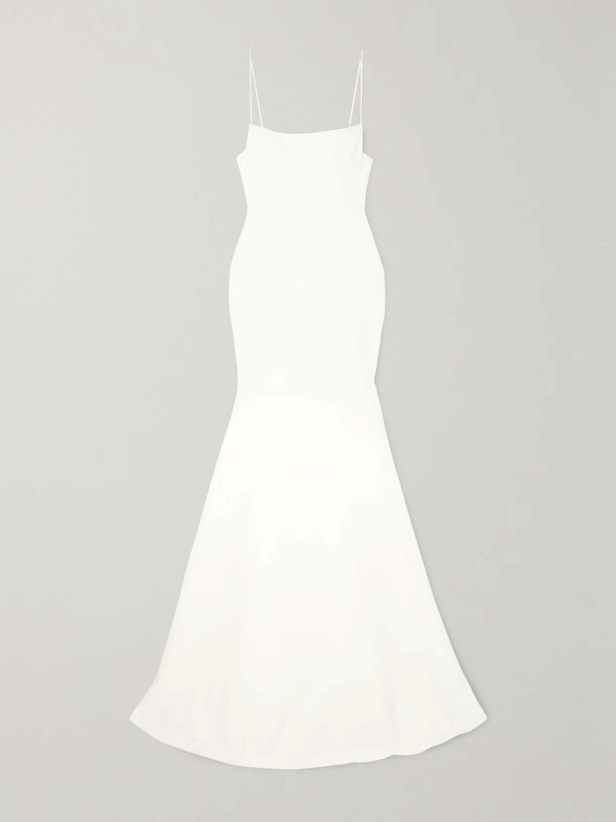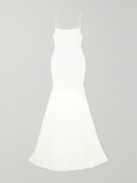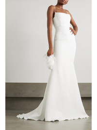 EXCLUSIVE AT NET-A-PORTER. Sometimes the simplest silhouettes can have the most impact - Alex Perry's minimal 'Eliza' gown is guaranteed to look elegant from every angle, so you'll feel confident and beautiful on the big day. Cut from sumptuously weighty satin-crepe, it hugs your figure and flares out just below the thigh to a graceful train that sweeps the floor. The barely-there straps and square neckline frame your decolletage, so sweep a little highlighter across your collarbones.