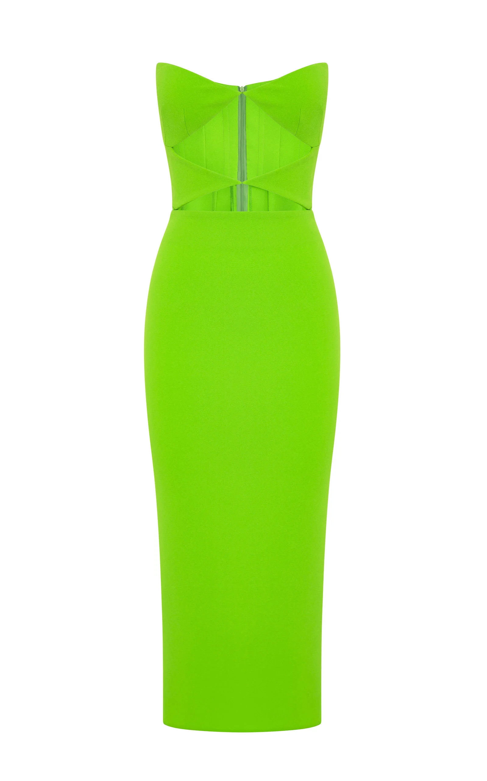 PRODUCT DETAILS - As featured in the Spring Summer '22 lookbook, pair yours with boots to mirror the brand styling - Slim fit, strapless, double cut out, midi hem, lined - Concealed zip fastening along back - This style fits true to size, we suggest taking your normal size - Composition: 63% polyester, 37% acetate; lining 63% polyester, 37% acetate - Dry clean only - Imported SIZE & FIT - Model is wearing a sample size AU 6 - Fits large to size, our fit specialist recommends taking one size down