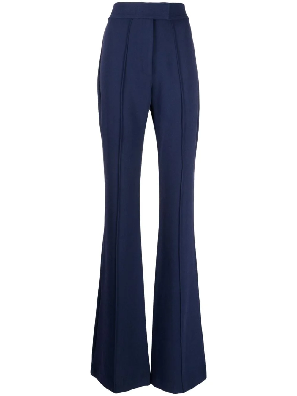 high-waisted flared trousers Highlights - Navy blue - Tonal stitching - Pleat detailing - Concealed front fastening - High-waisted - Flared - Two rear welt pockets - Straight hem Imported Composition Polyester 63%, Acetate 37% SIZE & FIT Model measurements Height 5 ft 10 in(1.77 m) Bust/Chest 28.74 in(73 cm) Hips 35.82 in(91 cm) Waist 24.4 in(62 cm) FittingInformation Designed for a tapered fit, these trousers allow for a close fit at the waist and a loose unrestricted fit over the leg with a closer fit towards the ankle Particularly long in length; consider your own measurements Made from a midweight non-stretch fabric, this piece offers minimal elasticity when worn This piece fits true to size – those with curvy hips may wish to take one size up