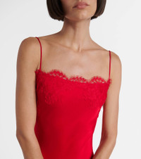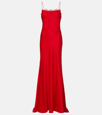 The bias-cut gown by Alex Perry is crafted from crepe satin flowing fluidly around the waist into an ample train. The design features slender straps, a low back, and delicate French lace along the neckline. Product Details - Material: 80% acetate, 20% polyester - Care instructions: dry clean - Made in China - Designer color name: Red - Item color: red - Lace: 48% polyamide, 26% cotton, 26% modal - Closure: zipped back - Item number: P01081200 Size & Fit - Fits large to size - we recommend trying one size smaller - Low back - Cinched waist - Non-stretchy fabric - The model seen in the picture is 178cm-5'10" and wearing a size UK 6