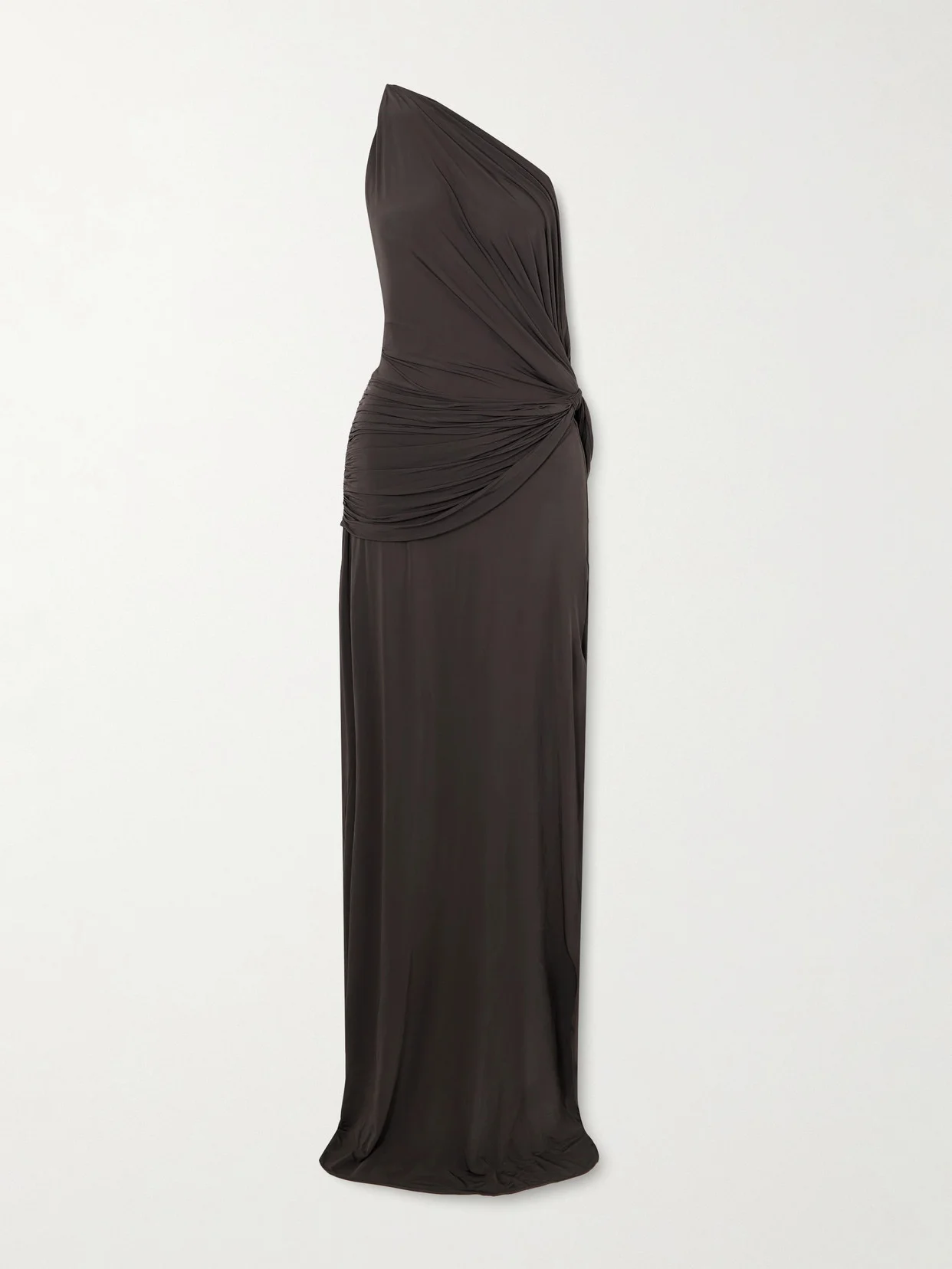 A study in modern glamour, Alex Perry's gown balances drama with ease. Cut from stretch-jersey, it features a draped bodice that sculpts your waist before falling to a fluid, floor-grazing skirt. Keep accessories pared back, letting the one-shoulder neckline steal the focus.