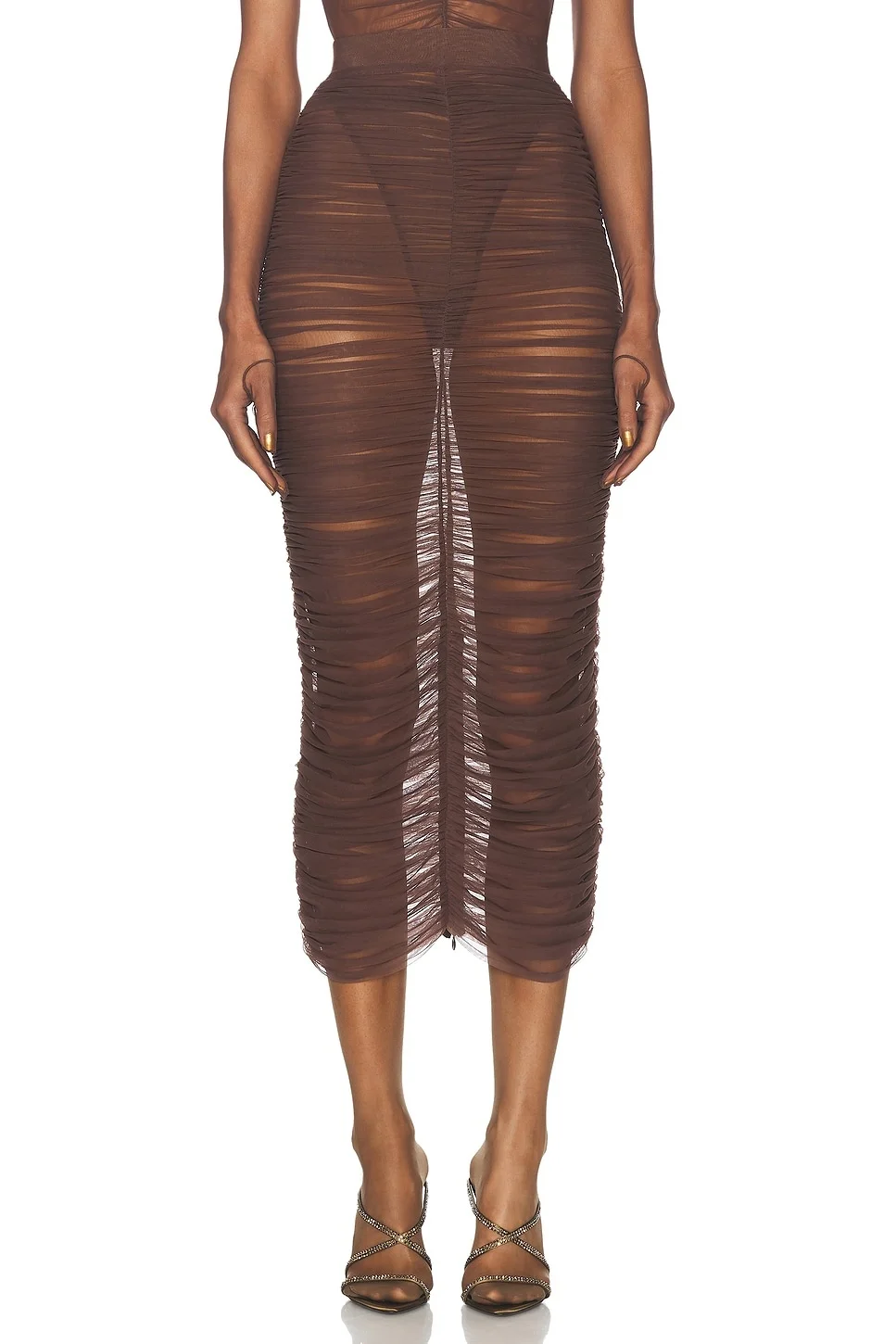 Details - 88% polyamide, 12% elastane - Made in China - Dry clean only - Unlined - Elastic waistband and hidden back zipper closure - Sheer mesh fabric with ruching throughout - Item not sold as a set - Our Style No. APEF-WQ53 - Manufacturer Style No. S0174FW24