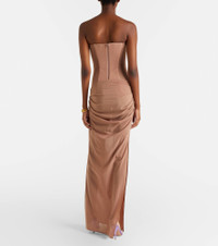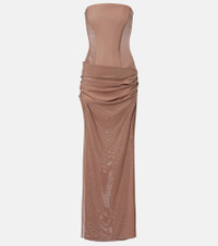Exude glamour in this pink gown from Alex Perry. The semi-sheer design boasts a sculpted silhouette with a strapless neckline and internal boning for added support. Product Details - Material: 81% polyamide, 19% elastane - Care instructions: dry clean - Made in Australia - Color: pink - Designer color name: Mink - Boning - Closure: invisible zipper - Item number: P01112653 Size & Fit - Fits large to size - we recommend trying one size smaller - Strapless - Internal boned corset for support - Semi-sheer - Fitted - Slightly stretchy fabric - The model seen in the picture is 178cm-5'10" and wearing a size UK 6