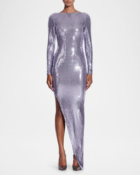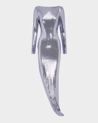 Sequined Mesh Long-Sleeve Draped Backless Asymmetric Gown