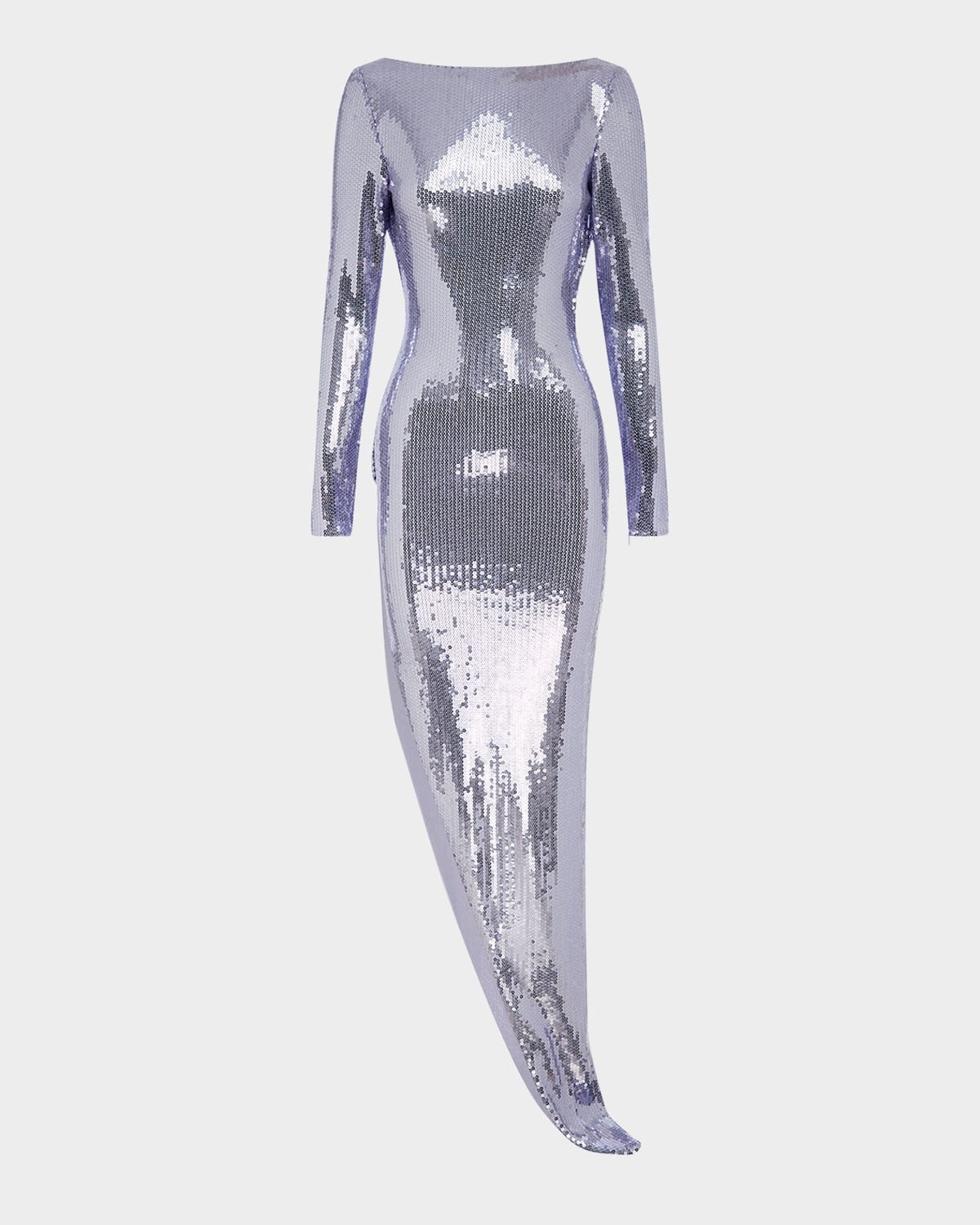 - Alex Perry sequined mesh gown featuring a draped open back and an asymmetric hem - High neckline - Long sleeves - Body-skimming silhouette - Floor length - Invisible side zip - Polyester/spandex - Imported