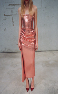 The Australian couturier is famous for his sharply clean and seductive red carpet gowns and black tie minis, each tailored with the utmost precision to ensure second-skin fits. Covered in copper-toned sequins, this formal midi is structured with a fitted corset and skirt, distinguished by draped detailing across the waist. For a polished finish, add a suede clutch and heels. PRODUCT DETAILS - Pre-Fall '25 - Zip fastening - Composition: 95% polyester, 5% elastane - Designer color: Copper - Dry clean only - Imported
