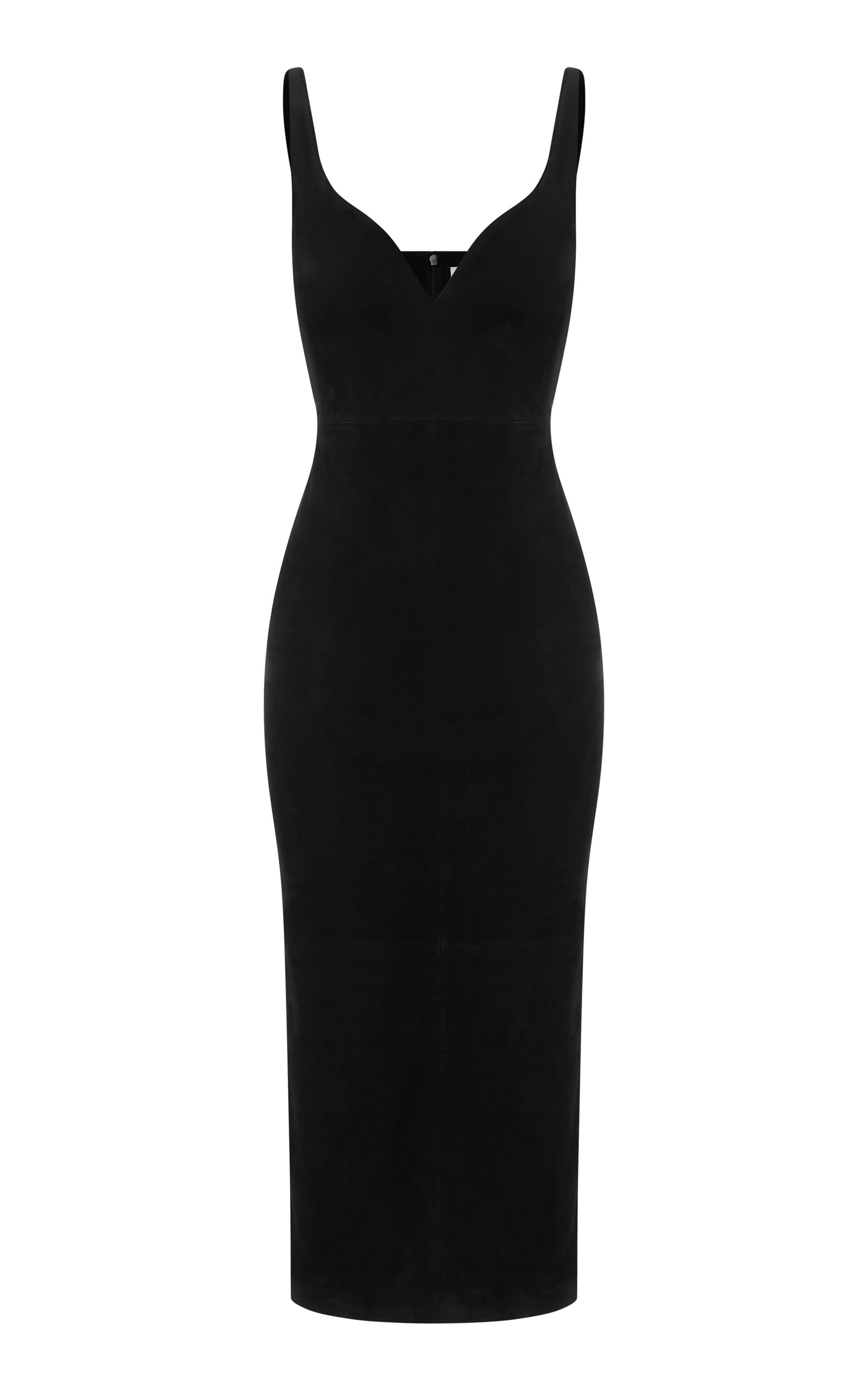PRODUCT DETAILS - Sleeveless, deep sweetheart neck, pencil silhouette, buttery suede, midi hem - Concealed zip fastening along back - Lined - Composition: 100% Leather - Color: black - Dry clean only - Spring/Summer '25