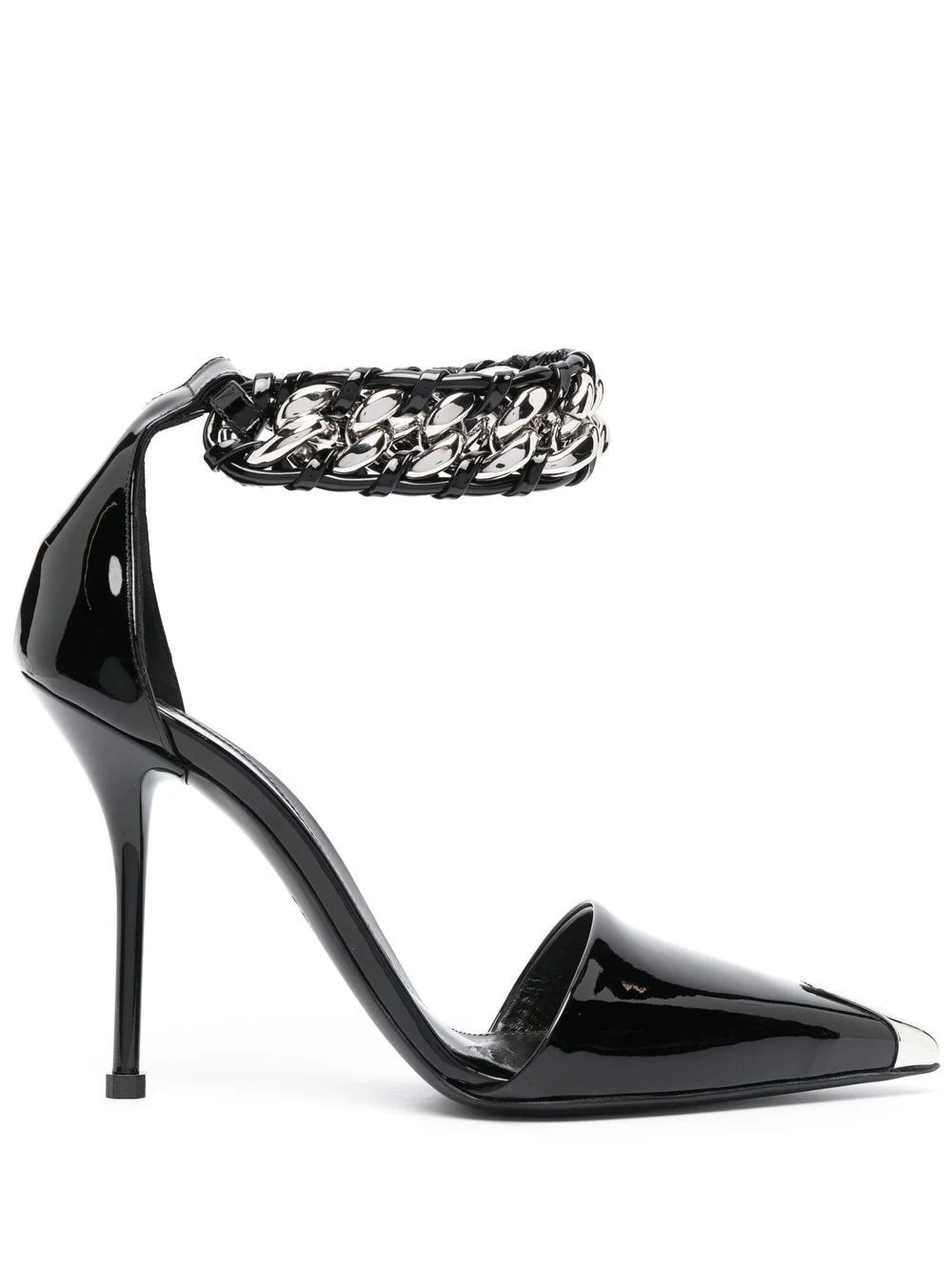 105mm chain-trim leather pumps black calf leather silver-tone hardware branded insole chain-link detailing pointed toe buckle-fastening ankle strap high stiletto heel Made in Italy Composition Lining: Calf Leather 100% Sole: Calf Leather 100% Outer: Patent Calf Leather 100% SIZE & FIT Measurement CIRCUMFERENCE 8.66 in(22 cm) HEEL 4.13 in(10.5 cm) HEIGHT 3.54 in(9 cm)