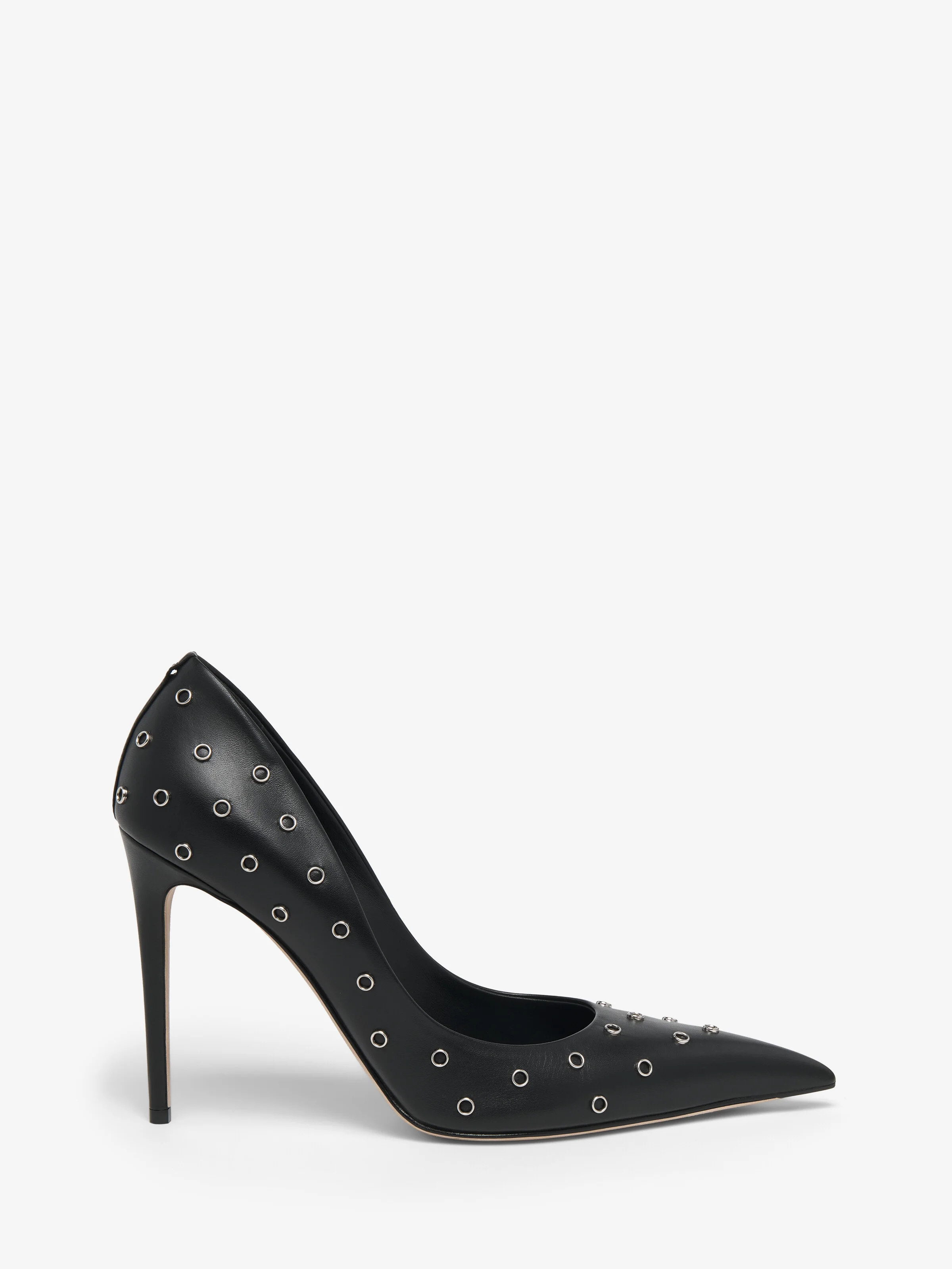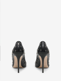 The Skull Pump – shiny black calf leather with silver metal eyelets and a sharp pointed toe silhouette. Finished with a silver-tone skull charm hanging from the back of the left shoe. Product details - Sharp pointed toe - Leather sole - Heel height: 105mm / 4.1 inches - Product code: 856084WIAJI1064 - Made in ITALY - Material: Calf Leather