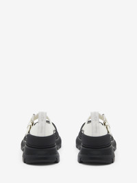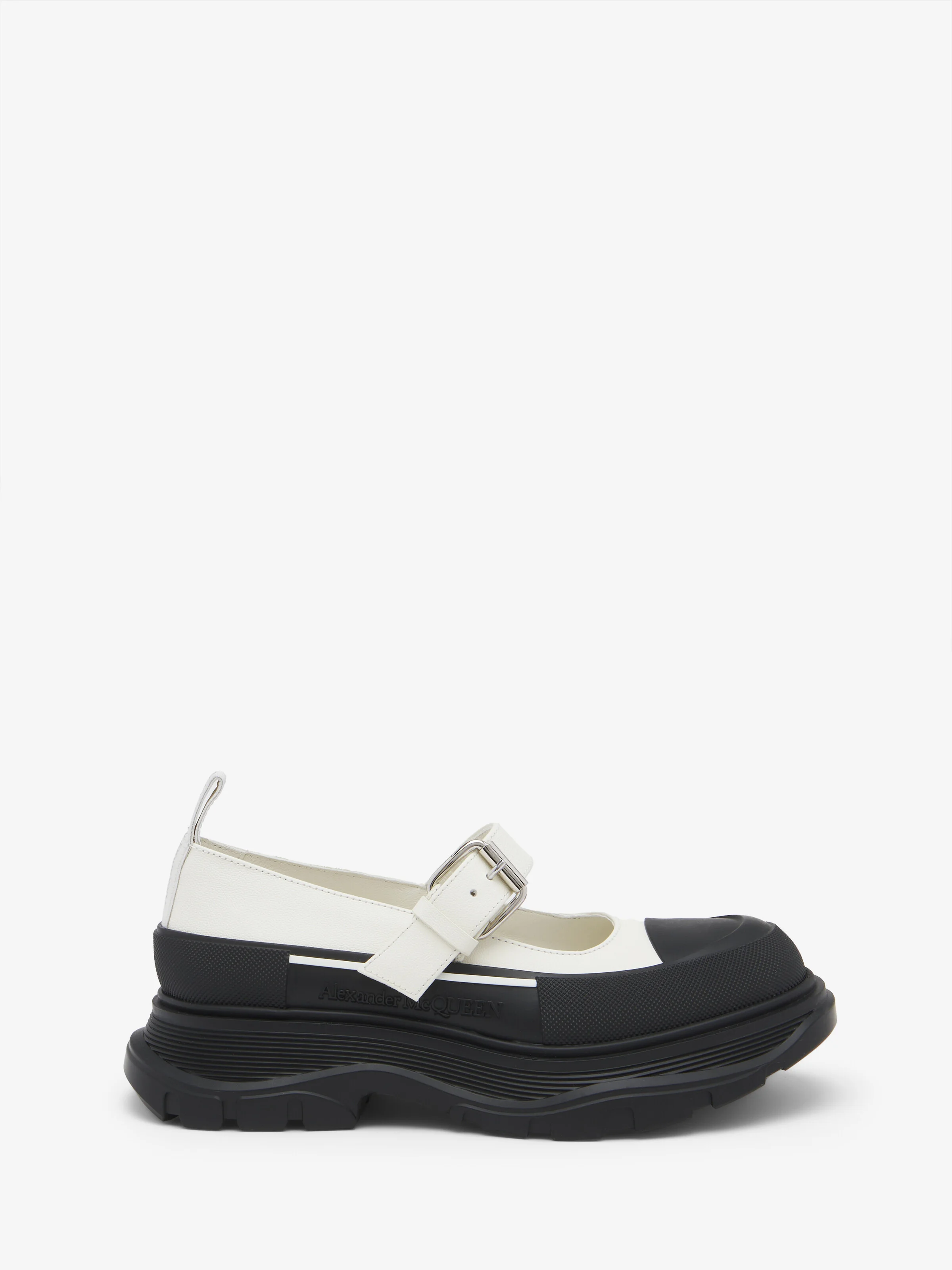 The Thread Slick Mary Jane—snow nappa leather with adjustable buckled strap. The shoe is detailed with a textured rubber wrap and a tonal McQueen signature. Finished with a lightweight oversized black rubber tread sole. Product details - Buckle closure - McQueen signature - Round toe - 50 mm lightweight rubber tread sole - Product code: 839638WIAGY9522 - Made in ITALY - Material: 100% Calf Leather