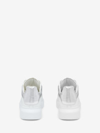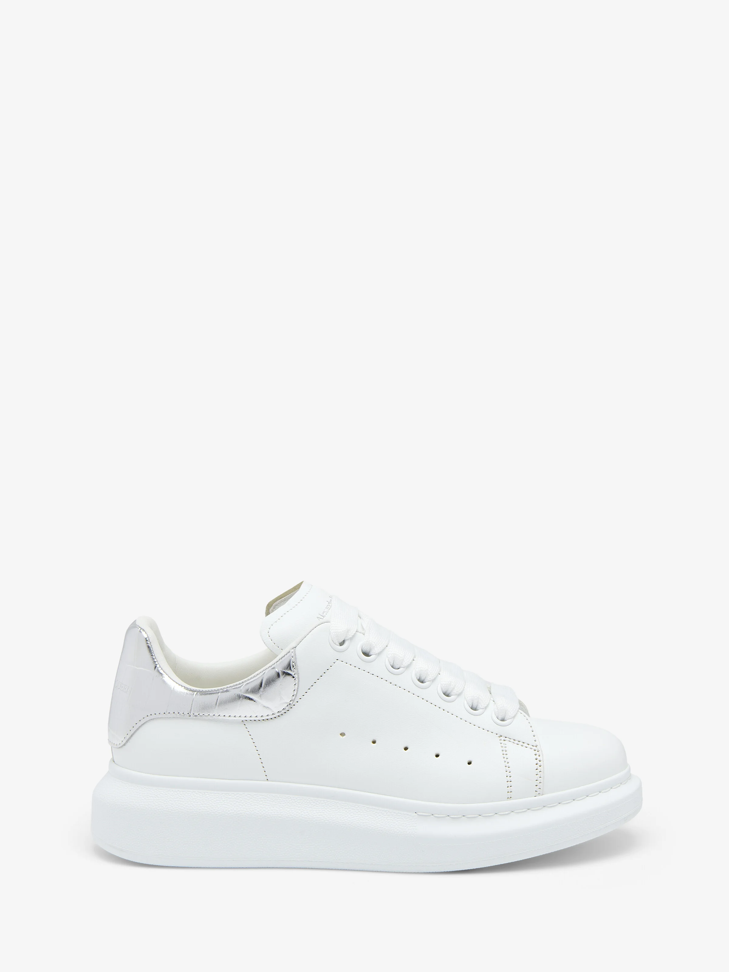 The Oversized Sneaker—statement silhouette in white calf leather, with a metallic silver croc-embossed heel counter featuring the McQueen signature. Finished with a chunky rubber sole. Product details - Round toe - McQueen signature - Contrasting heel counter - Oversized rubber sole - Additional pair of shoelaces included - Product code: 553770WIAH09081 - Made in Italy - Material: Calf Leather