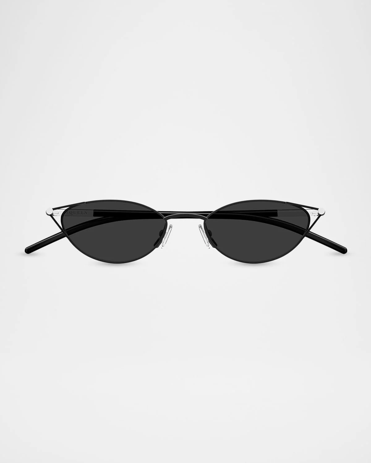 McQueen "AM0563S" sunglasses feature a sleek, metal cat-eye silhouette with a narrow, low-profile frame. Eye/bridge/temple (in mm): 50-18-145 Monochromatic lenses Adjustable nose pads Logo-engraved temples Thin acetate arms Metal/acetate 100% UVA/UVB protection Made in Japan
