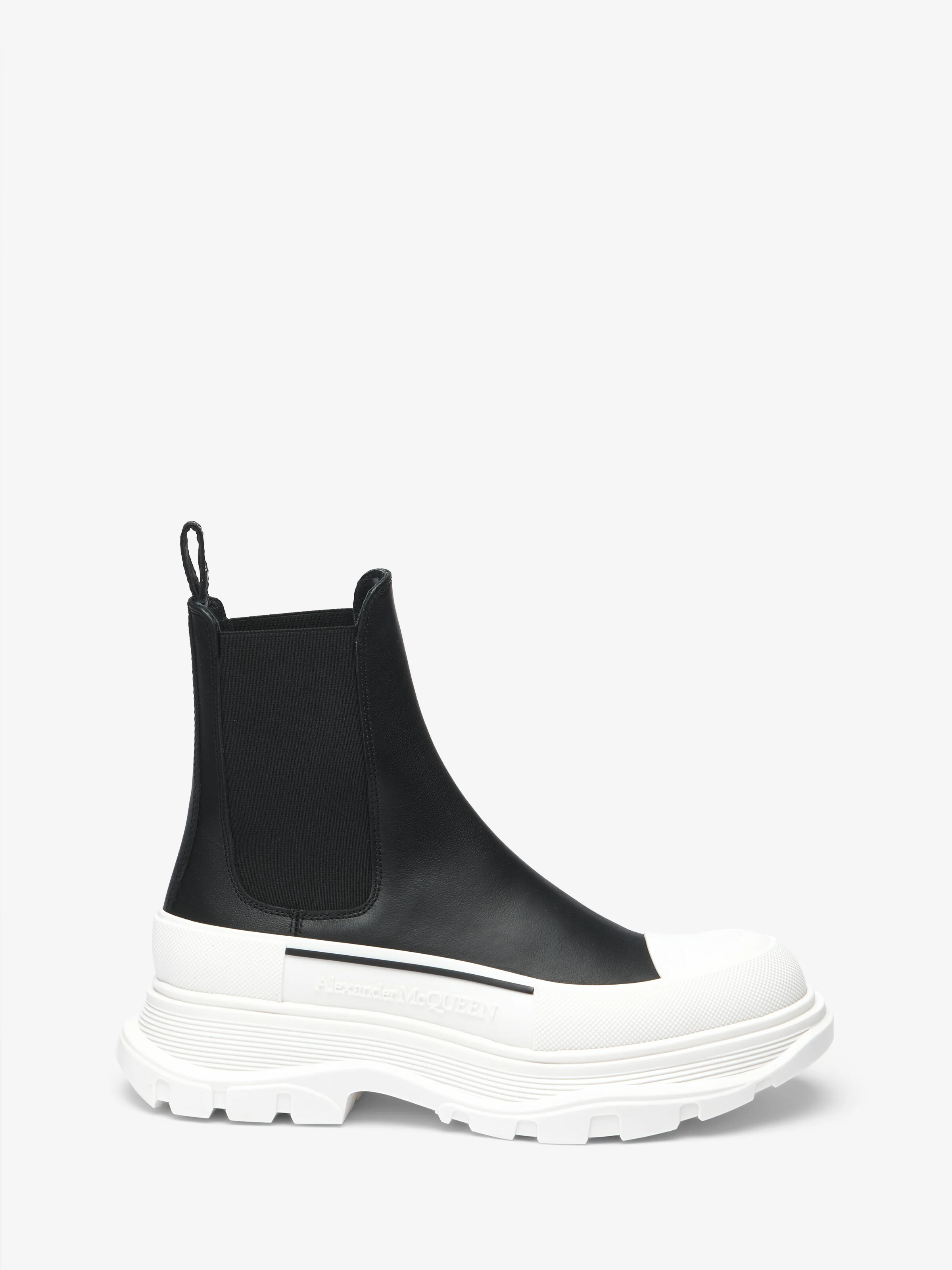 The Slick Chelsea Boot – black leather with elasticated side panels. The boot is detailed with a textured rubber wrap and a tonal McQueen signature. Finished with a white lightweight oversized rubber tread sole. Product details - Elasticated side panels - McQueen signature - Round toe - 45mm lightweight rubber tread sole - Product code: 635714WIAGY1021 - Made in ITALY - Material: 100% Calf Leather