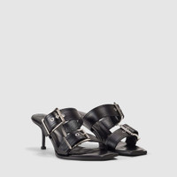 - Black - Leather - Stiletto Heel - Silver Finish Buckles - Padded Leather Insole - Square Toe - Alexander McQueen Branding With plenty of vintage influence, Alexander McQueen’s Buckle Mules are a pair that promise to lend timeless and elegant appeal to any look. These slip-on mules take on a classic black leather craft while adorned with silver-toned buckles across the straps. Over a low stiletto heel, the shoes make for a sophisticated finish to everything whether it be dresses or your newest pantsuit. Signature Alexander McQueen branding is seen throughout. Total heel height 65mm. Fits true to size, take your normal size.