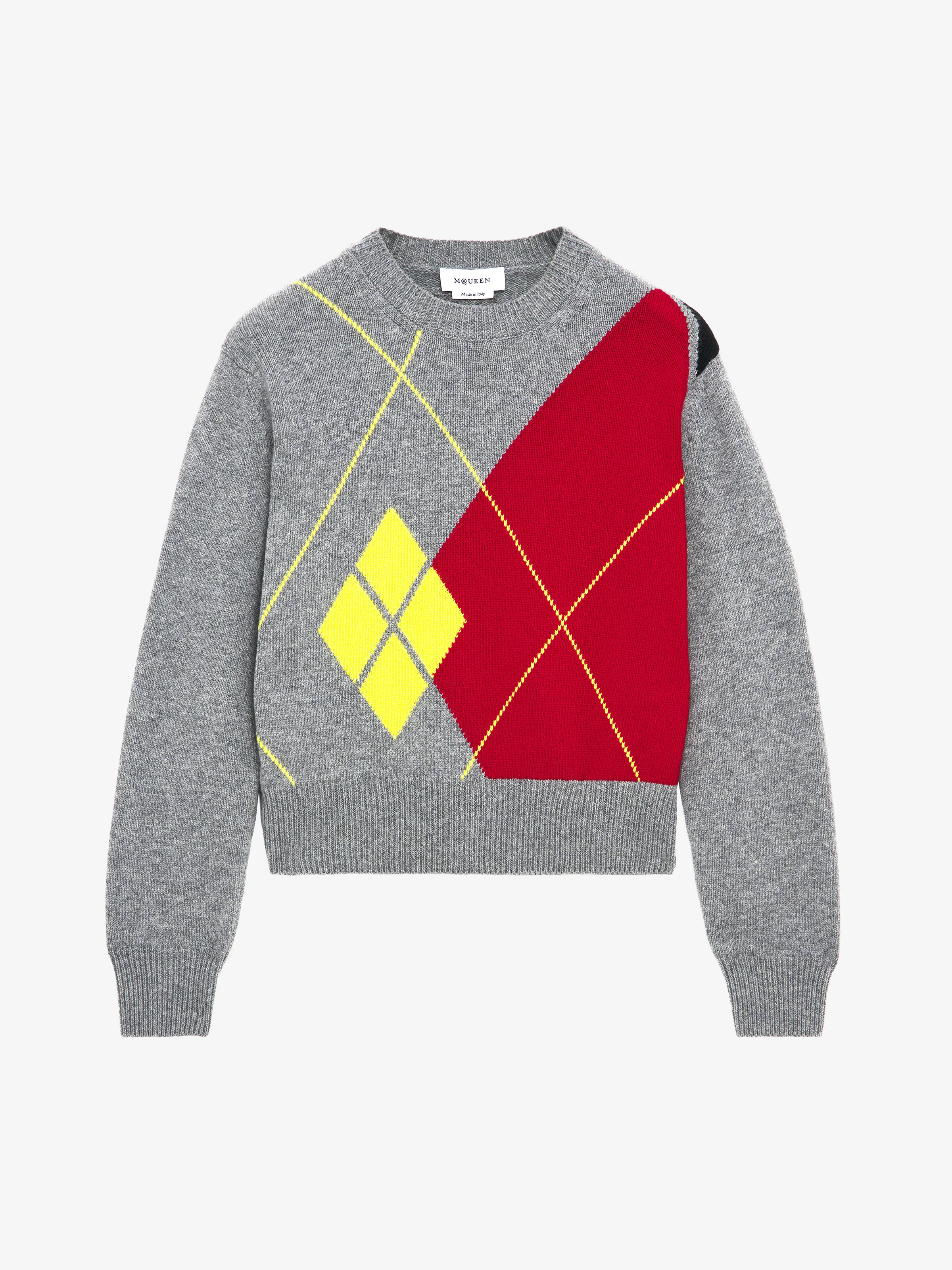 Crew neck jumper in grey wool with a red and yellow Argyle intarsia. Long sleeves and ribbed trims. Product details - Crew neck - Long sleeves - Ribbed trims - Product code: 858206Q1BFZ1164 - Made in ITALY - Material: 100% Wool