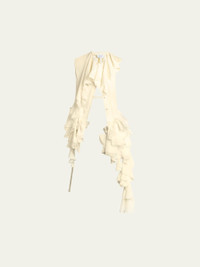 This McQueen silk shirt flutters with cascades of ruffles draping into an asymmetric hem, the open back gathered by an adjustable strap below the waist Jewel neckline Button front Sleeveless High-low hem Relaxed fit Silk/silk Made in Italy Online Inquiries: BGS21_BB05Q| Store Inquiries: #5369503