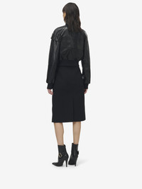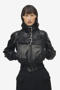 Bomber jacket in black grainy lambskin leather. High neck, belt detailing across the front and back, side pockets and elasticated cuffs and hem. Finished with a front zip fastening. Product details - High neck - Side pockets - Front zip fastening - Product code: 848211Q5AP41000 - Made in ITALY - Material: 100% Lamb Leather