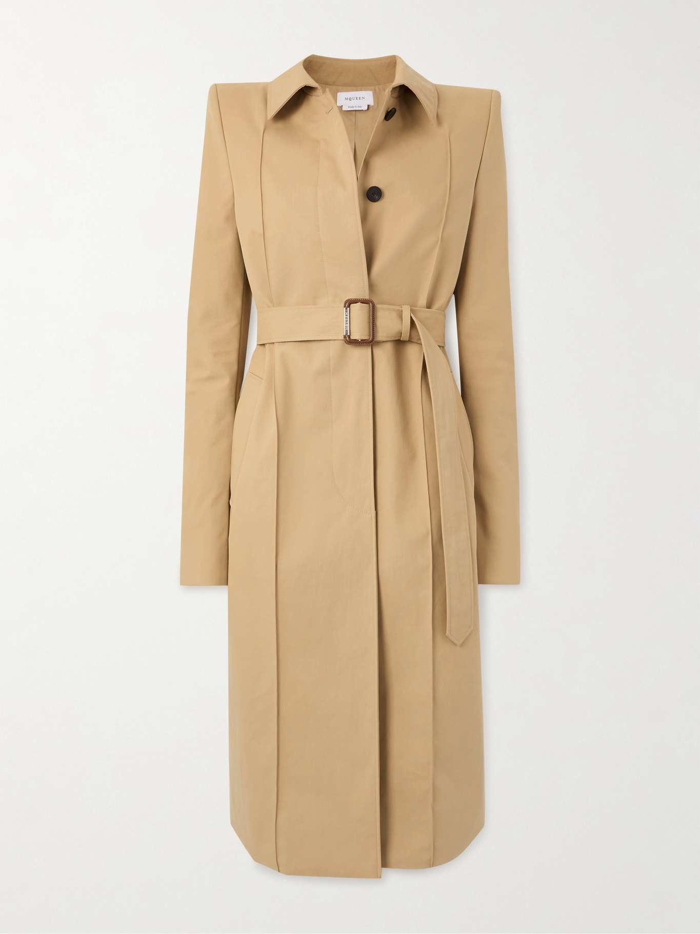 EDITORS'NOTES Alexander McQueen's trench coat is traced with elongating raised seams that extend from the sharply padded shoulders to the midi hem. It's cut from lightweight cotton-gabardine and comes with a belt to define the boxy shape. SIZE & FIT Model measurements: - Fits true to size, take your normal size - Intended for a boxy fit, use the belt to cinch in at the waist - Internal shoulder pads - Lightweight, non-stretchy fabric - Model is 177cm/ 5'10" and is wearing an IT 38 - Bust: 77cm/ 30.5" - Waist: 60cm/ 23.5" - Hip: 92cm/ 36" DETAILS & CARE - Beige cotton-gabardine - Partially concealed button fastenings through front - 100% cotton - Specialist clean